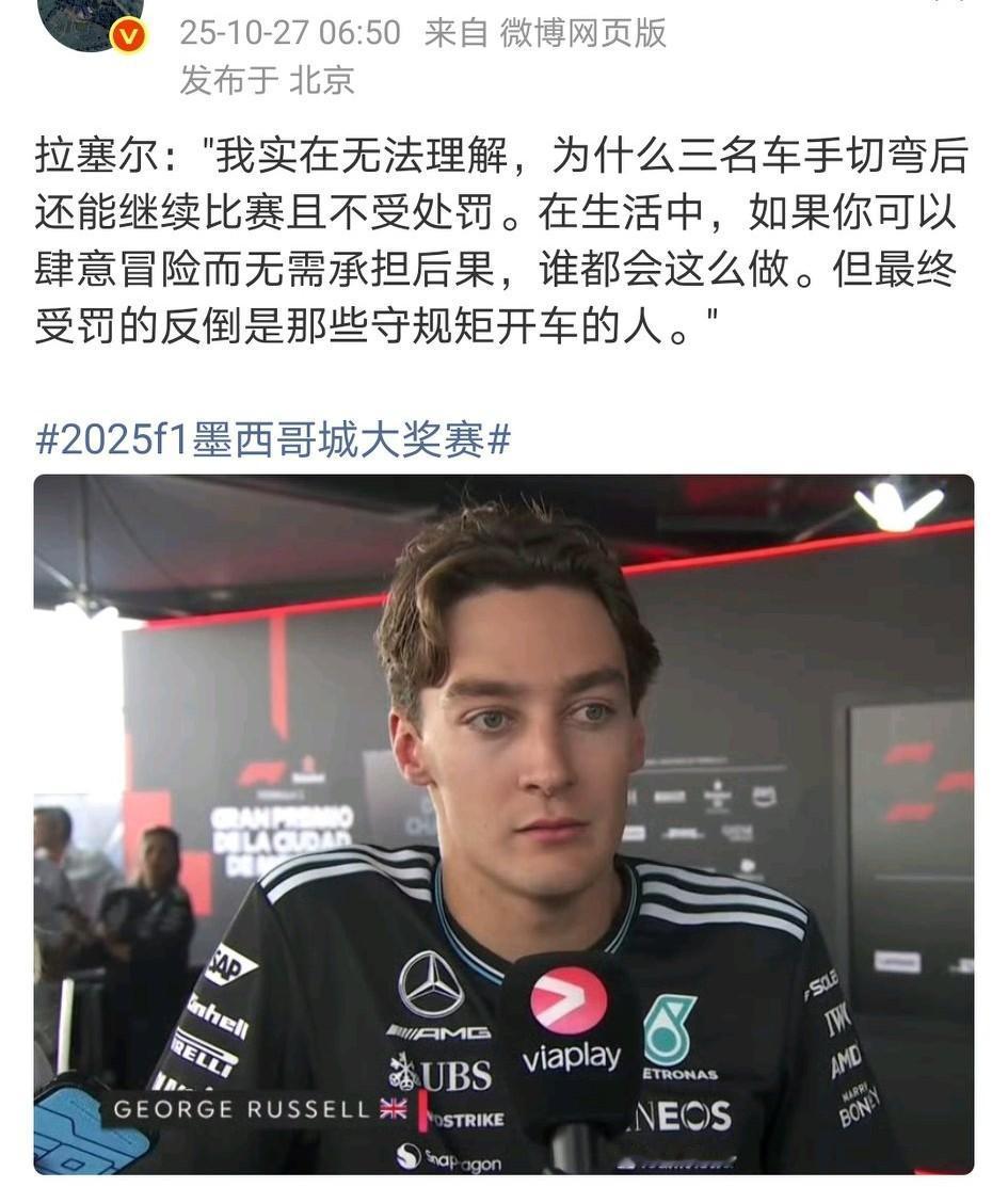 汉密尔顿:FIA判罚双标…… 拉塞尔非常不满:“这太荒唐了,这个家伙可以直接切弯然后守住位置,还没有处罚。” 结果:维斯塔潘1号弯未受罚引发质疑;汉密尔顿4号弯罚时10秒,直接影响他的正赛排名。