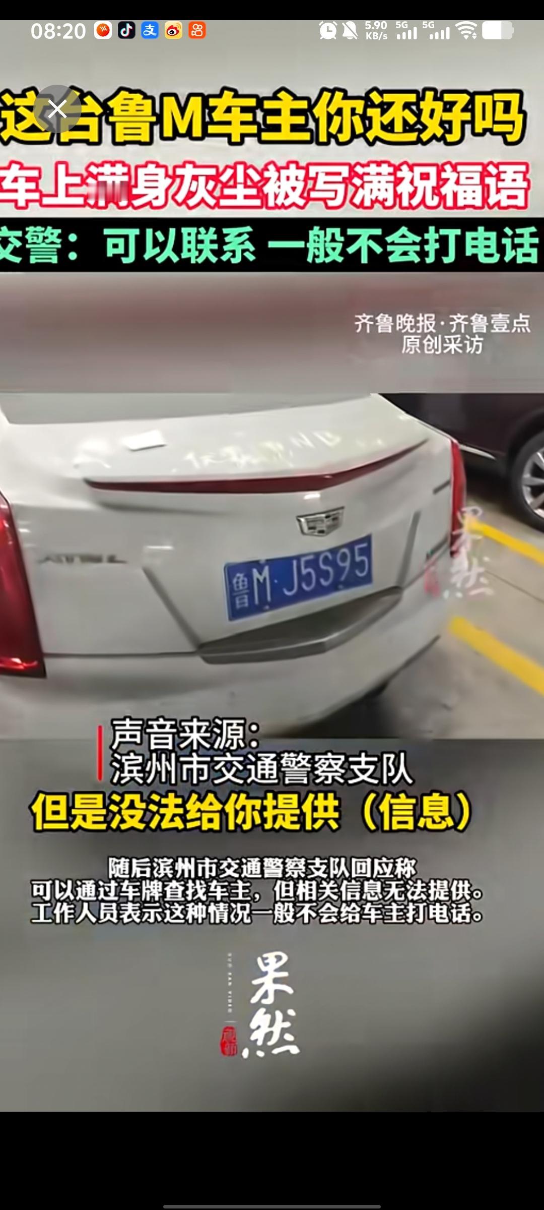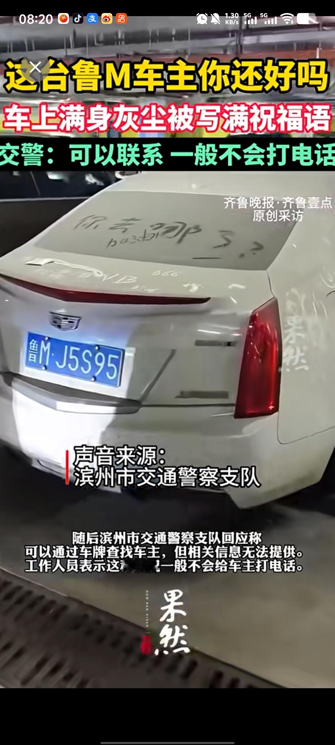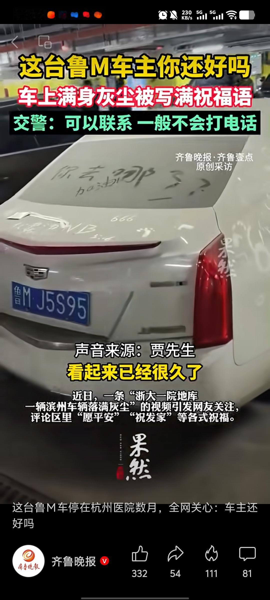 滨州这名凯迪拉克车主!你在哪里? 据九派新闻:10月23日(采访时间),浙江杭州,某医院停车场“鲁M J5S95”车辆落满灰尘,路人在车身上暖心留言。 拍摄者:5月份就看到这辆车停在这,希望车主一切安好。 另据齐鲁晚报:该车自5月份起停放在浙江杭州某医院的地下停车场,至10月23日被网友发现时已落满灰尘,引发了广泛关注。停车场工作人员和保安已尝试联系车主,但尚未成功。齐鲁晚报·齐鲁壹点记者多方沟通后,也未能取得联系。 来源 综合九派新闻 齐鲁晚报等