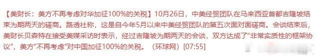 美财长:美方不再考虑对华加征100%的关税。