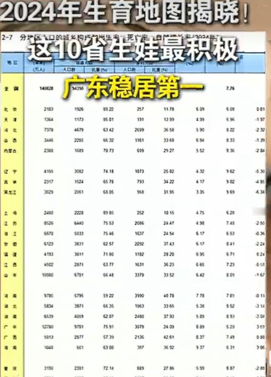 根据国家统计局数据,2024年全国出生人口954万人,出生率为6.77‰,其中14个省份出生率高于全国水平 。广东2024年出生人口达113万人,比上一年增加了10万人,出生率为8.89‰,连续7年成为全国生育第一大省,也是连续5年唯一出生人口超100万的省份 。 广东生娃积极性高主要有以下原因: - 育龄人口基数大:广东常住人口总量位居全国第一,2024年常住人口突破1.27亿,且省外流入人口总量非常大,这些流入人口大多是20到40岁的育龄群体,为生育提供了坚实的人口基础。 - 生育政策支持:广东出台了一系列生育友好政策,如女职工能享受法定产假,配偶还有陪产假,不少地方还探索了育儿假。政府鼓励用人单位在厂区、办公楼附近办托育点,社区里的普惠托育机构也越来越多,减轻了家庭的养育负担。 - 传统生育文化影响:在粤东的潮汕、粤西的湛江等地,受传统的生育文化影响,“多子多福”的观念依然根深蒂固,生育意愿相对较高。