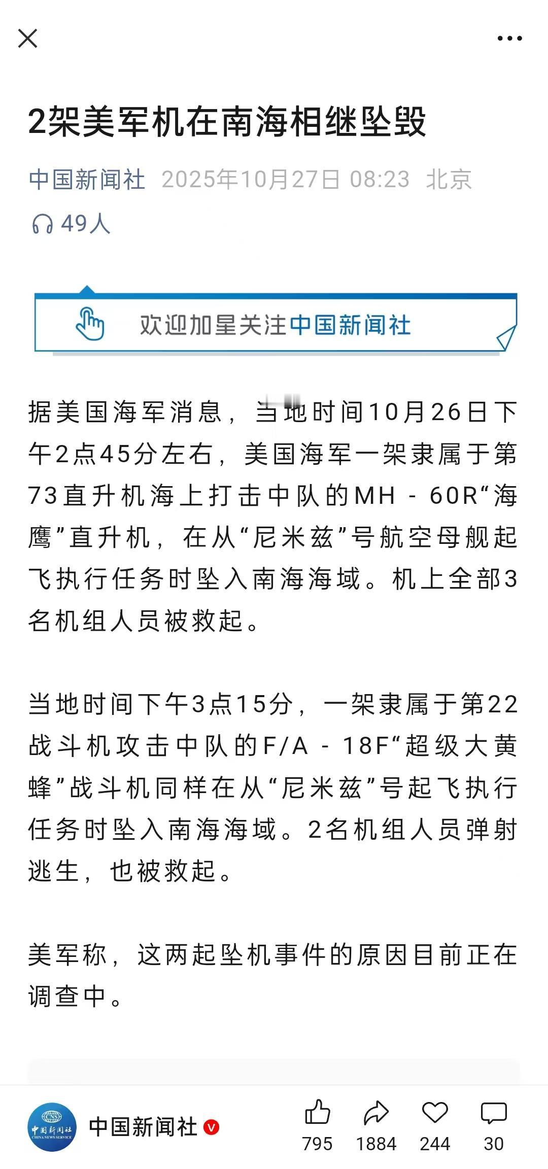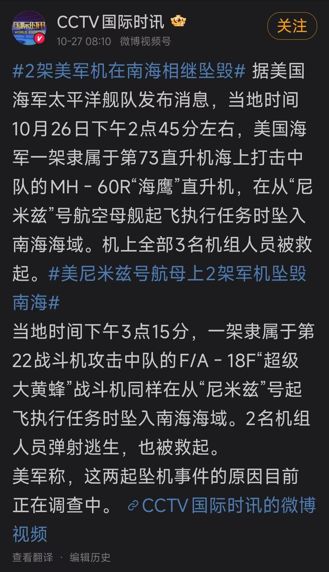 美机缘何在南海频频坠落?着落的军机均属于美国海军尼米兹航母编队,一架隶属于第73直升机海上打击中队的MH - 60R“海鹰”直升机,一架隶属于第22战斗机攻击中队的F/A - 18F“超级大黄蜂”。美军称,这两起坠机事件的原因目前正在调查中。 推测坠毁原因,大致有三种情况: 一是发生了不可描述的战斗。东大的飞机出其不意,使用了某种新式武器导致坠落,这是不少看热闹不嫌事大的人热议的。纯属胡扯,毛衣战虽然持续不断,但是新的谈判还是向好的,再说也没到兵戎相见的地步。 二是霉菌训练松弛军纪涣散。这个倒是有可能的,毕竟这是“尼米兹”号航母退役前最后一次部署执勤,在这之前已经部署了长达7个月。“尼米兹”号航母计划于2026年5月正式退役,结束其长达50年的服役生涯,届时将前往纽波特纽斯造船厂开始退役流程。部署时间长不免疲惫,到南海后又要高度戒备,难免发生意外。 三是美军内部发生兵变,被自己人干掉了。这个纯粹美剧看多了,以为是末日孤舰啊。