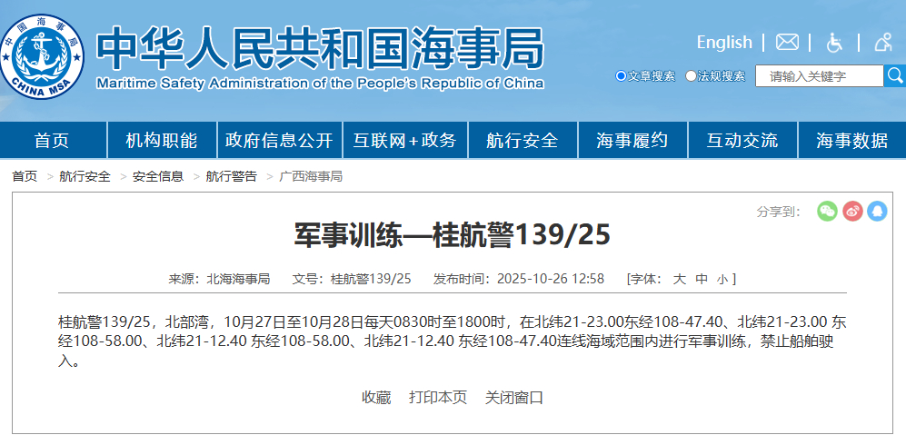 #北海海事局发布航行警告#【航行警告:#北部湾部分海域进行军事训练#】据中国海事局网站消息,北海海事局发布航行警告,10月27日至10月28日每天8时30分至18时,北部湾部分海域进行军事训练,禁止船舶驶入。