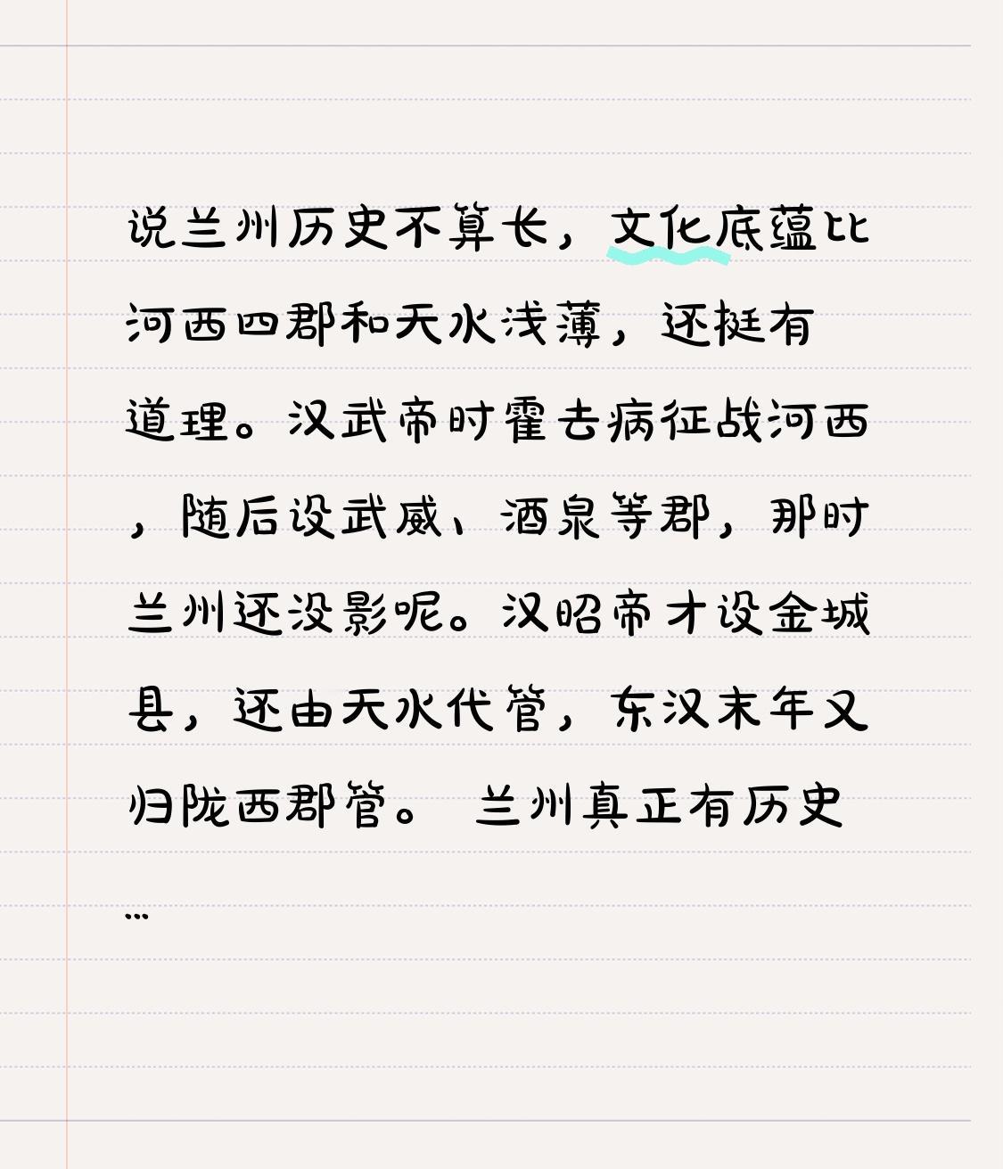 说兰州历史不算长,文化底蕴比河西四郡和天水浅薄,还挺有道理。汉武帝时霍去病征战河西,随后设武威、酒泉等郡,那时兰州还没影呢。汉昭帝才设金城县,还由天水代管,东汉末年又归陇西郡管。 兰州真正有历史得说明清。明朝设兰州卫,清朝陕甘分治后,行政中心才迁到兰州。而河西走廊在汉朝后经历了前凉、后凉等诸多时期,还有凉州会盟、万国博览会等大事。相比之下,兰州历史确实起步晚,底蕴也不够深厚。