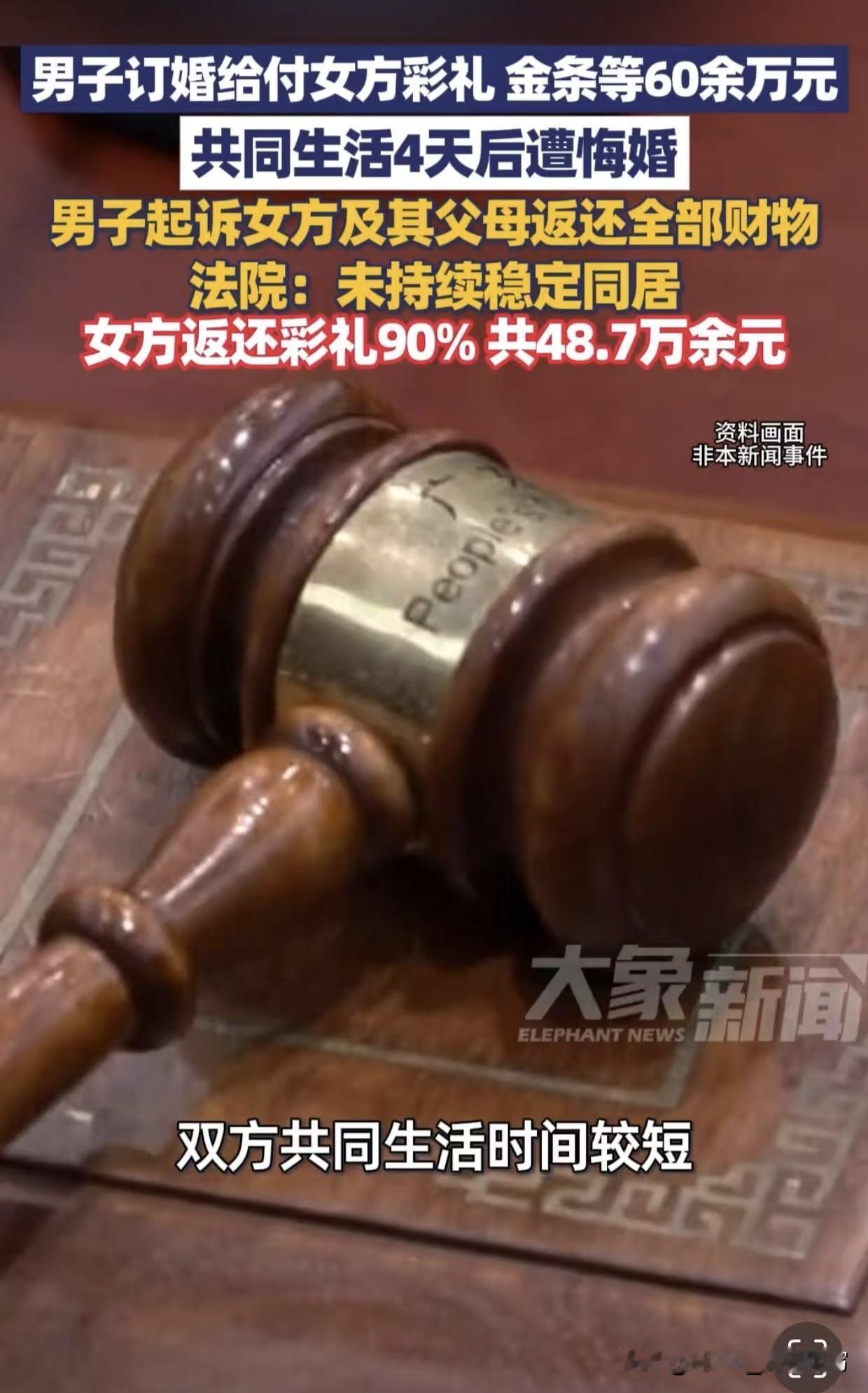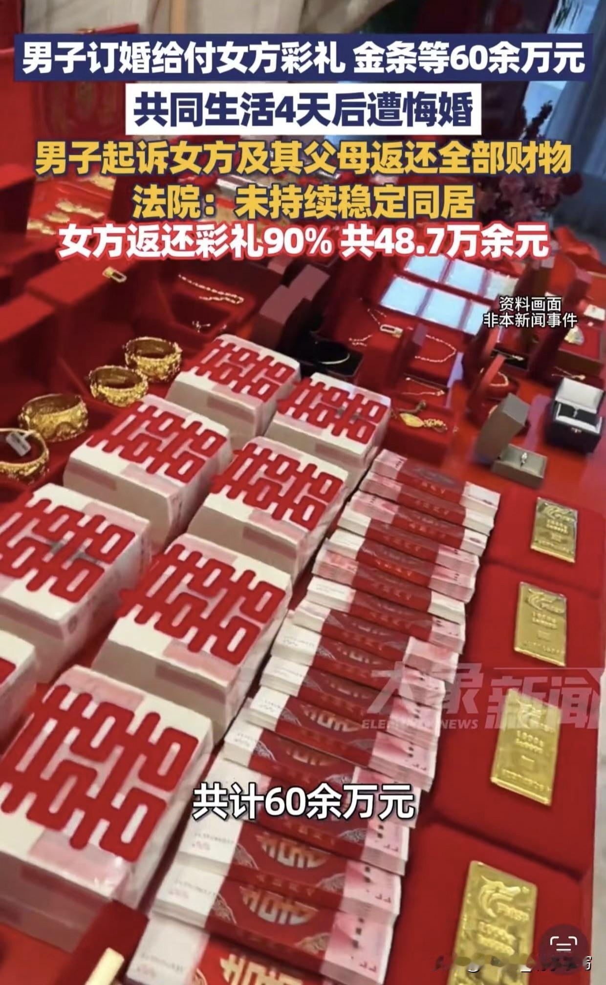60万彩礼,4天同居,退48.7万! 这哪是结婚,简直是“上班打卡”! 江西一小伙掏光家底订婚, 结果女方转身就走,法院判退钱,算下来一天净赚3万多! 见面礼、大红包、金条金镯子,样样不少,钱一到手,婚事黄了。 你说气不气?感情可以散,但60万可不是小数目,是一个家的希望啊! 现在倒好,婚没结成,钱快没了。彩礼本是诚意,不是“赎身费”! 真怕这种事多了,以后男的不敢娶,女的不敢信,婚姻越来越凉。 咱们支持婚恋自由,但别让爱情败给价钱! 你咋看?要让更多人看到这背后的无奈!