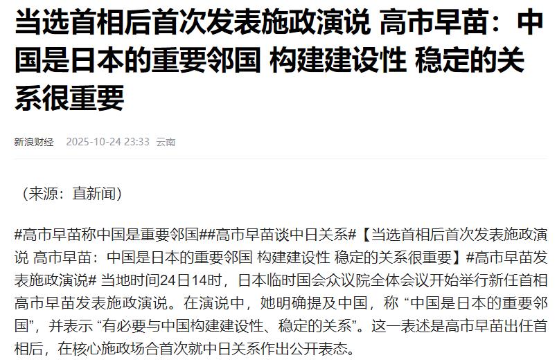 高市早苗的施政演讲,让恨国贼们失望了吧。 就在10月24日,日本新任首相高市早苗的施政演讲草案对外披露,其中提到中国的部分格外引人注意。这份草案里直接把中国称作"重要邻国",还明确说希望能通过首脑之间的对话,推进双方的战略互惠关系。 简单说就是要让中日双方在互相尊重的前提下,找一些能一起合作的事。而这样的说法,和她没上台前给大家的印象完全不一样。 还记得之前竞选的时候,高市早苗可不是这样的态度。那时候为了争取选票,她在多个竞选集会和媒体采访中,都发表过不少对外强硬的言论,尤其是在涉及中国的议题上,话里话外都带着激进的调子,也正因为这样,她吸引了不少右翼势力的支持。 当时不光是媒体,就连不少分析人士都觉得,要是高市早苗真当选了首相,中日之间的关系说不定会瞬间激化。可没想到刚一正式走上首相岗位,这份施政演讲草案就来了个"画风突变",对华态度一下子变得务实又温和,和竞选时的强硬劲儿形成了特别明显的对比。 从日本官方放出来的演讲草案内容里能看到,除了把中国定位成"重要邻国",还特意强调会在相互尊重的基础上处理两国关系,想在经济、环保这些老百姓能感受到的领域找合作机会。 这种说法既没跳出日本政府对华政策的大框架,又比之前的激进言论多了些灵活性。 熟悉日本政治的人都清楚,"台下说硬话、台上办软事"的情况早就不新鲜了。候选人竞选时为了拉到特定群体的选票,往往会把立场说得更鲜明甚至激进一些,这样才能让支持者记住自己。 可一旦真的坐到执政的位置上,要考虑的就多了——国内的经济发展、民生问题,还有和其他国家的外交关系,哪一样都不能马虎,这时候务实主义就成了制定政策的主要原则。 高市早苗这次的言论转变,其实就是这种政治传统的体现,说到底还是日本政府在外交政策上的现实考量,毕竟真要像她之前表态的那样做事,日本说不定没几天就要亡国了。 现在能确定的是,早市早苗的表态至少传递出了愿意坐下来对话、通过沟通解决分歧、一起推进合作的信号,这在当前复杂的地区局势下,确实是个积极的方向。不过话说回来,施政演讲里的表态终究只是纸面上的内容,大家更关心的还是接下来的实际行动。 毕竟外交政策不是靠口号,而是靠一步步的具体举措来落实的。所以不管高市早苗这次的表述怎么变,最终还是要看她在任期间,到底会用什么样的实际行动来对待中日关系。