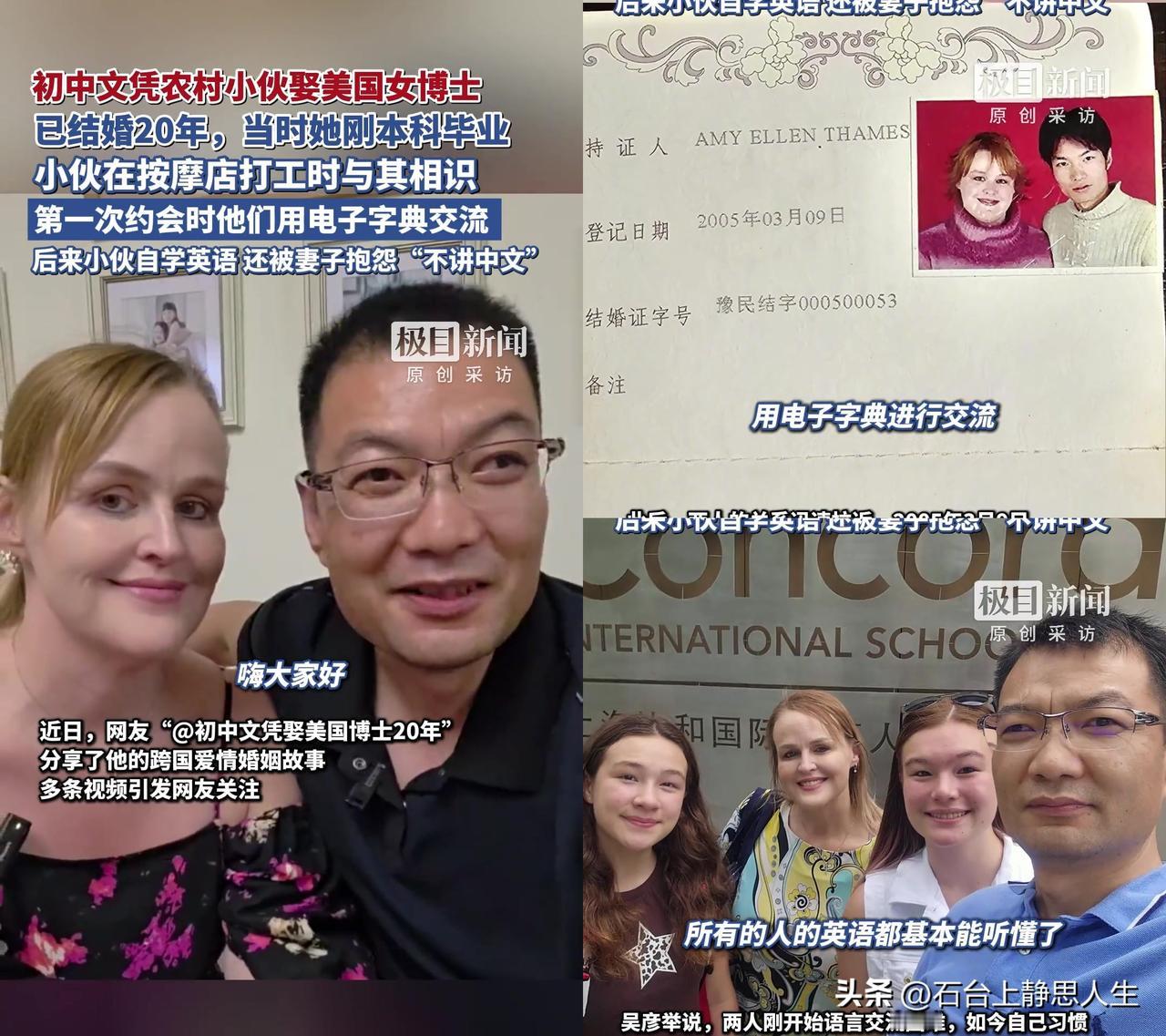 真没想到!初中文凭的农村小伙,居然把美国女博士拴了20年! 2004年在新疆按摩店打工,认识刚本科毕业的美国姑娘Amy。当时他一句英语不会,第一次约会靠电子字典翻;后来自学英语,现在被老婆抱怨咋不讲中文了?。如今俩女儿,老婆是国际学校幼教,日子稳得很。 有人说他肯定有啥过人之处,不然博士能看上?也有人说老外就是单纯,不在乎条件只讲爱;甚至有人说文化差异这么大,能过20年?怕不是演的? 但我觉得,哪有什么秘诀?不过是他肯用心,为了沟通啃英语;她肯包容,不在乎他没学历,就记着当年他帮她赶跟踪者的狠劲。爱情哪是计算题?不过是我愿意为你变,你愿意陪我熬。 大家觉得,他们能拴20年的秘密是啥?