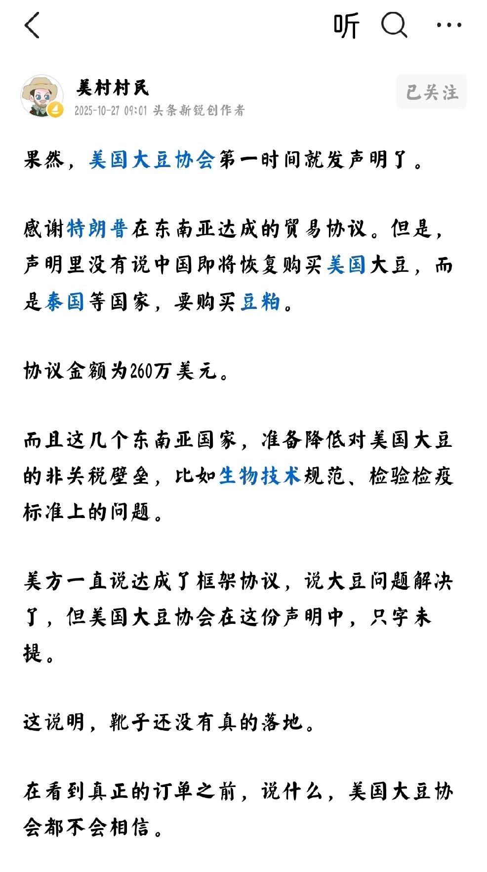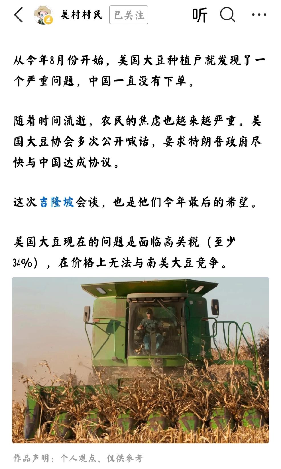 特朗普:安慰剂 个人观点:特朗普的亚洲之行,与东南亚各国签订协议,表面呈现硕果累累。可是美国大豆协会第一时间的声明,说明了问题的现状和本质。 个人看来,这如同医院医生给病重患者注射安慰剂一样,只能起到安慰作用,不能治疗,更不能治愈。 美国农民的生存问题又要如何解决呢?