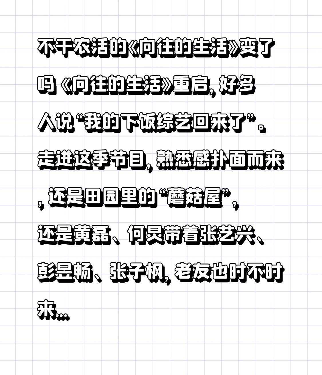 不干农活的《向往的生活》变了吗 《向往的生活》重启,好多人说“我的下饭综艺回来了”。 走进这季节目,熟悉感扑面而来。 还是田园里的“蘑菇屋”,还是黄磊、何炅带着张艺兴、彭昱畅、张子枫,老友也时不时来相聚。 不过变化也很明显。 曾经的“黄小厨”成了“艺术总监”,彭彭发量变多,狗老了、鸭走了。 节目从干农活种玉米,变成了搞戏剧,有话剧排练、即兴表演。 这一改变让口碑两极分化,有人质疑戏剧能否吸引观众,不干农活会不会平淡。 但这也是一种新尝试,就像总导演说的,录制时是和嘉宾开心舒服地度过时光。 至于下一季会怎样,还挺让人期待的。 其实,节目做出这样的改变并不难理解。 当下观众的审美和需求不断变化,一直守着干农活的模式,难免会让观众产生审美疲劳。 搞戏剧这种新形式,为节目注入了新鲜血液。 在话剧排练和即兴表演的过程中,嘉宾们展现出了不一样的一面。 张艺兴的表演天赋得以挖掘,张子枫在戏剧氛围中愈发灵动。 而且,戏剧本身就充满了故事性和冲突感,能为节目增添更多戏剧性和看点。 观众可以看到嘉宾们如何从对戏剧的陌生,一步步走向专业,这个过程充满了挑战与成长。 虽然有人担心不干农活会让节目变得平淡。 但换个角度想,这也是《向往的生活》在探索新的“向往”。 生活不只有田间劳作,还有艺术的滋养。 大家向往的生活,本就该是丰富多彩的。 说不定下一季,节目还会有更多意想不到的尝试。 也许是音乐创作,也许是手工制作。无论怎样改变。 只要能让观众在其中感受到温暖、快乐和生活的美好,那就是观众一直向往的《向往的生活》。 让我们一起期待它带来更多的惊喜吧!