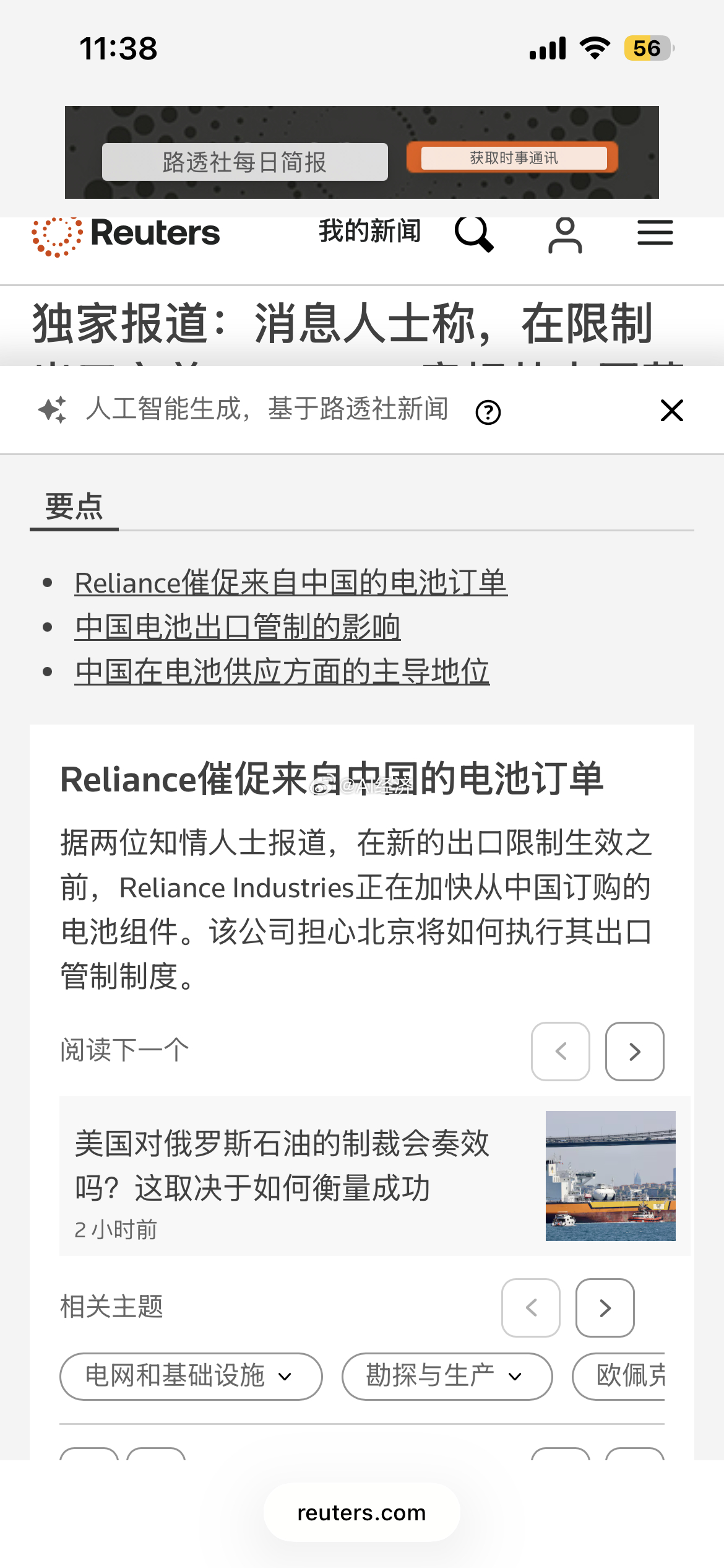 路透社 【独家】:消息人士称,信实工业正赶在出口限制实施前,争取从中国获得电池设备订单
