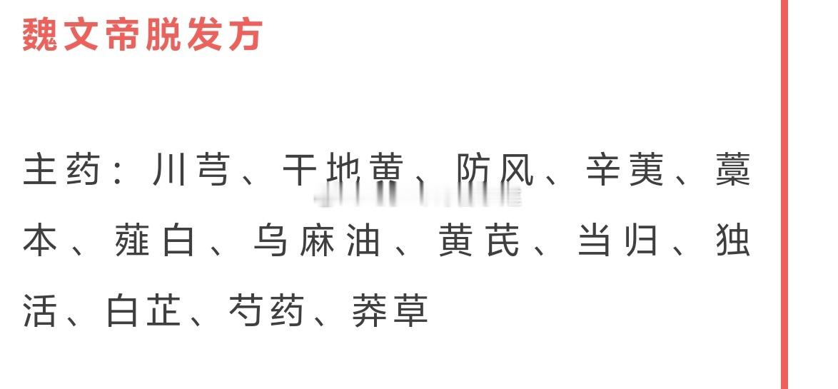 曹丕脱发治疗方案见图。此洗头疗效卓著,很快在脱发处长出新发。翻译过来就是将这些药物洗净打碎,然后冷水下锅,小火熬煮,煮开后倒入乌麻油,也就是现在的黑芝麻油。搅匀。头发洗净后,用棉签沾了药汁涂抹在头皮上。4至8个小时后再洗掉即可。