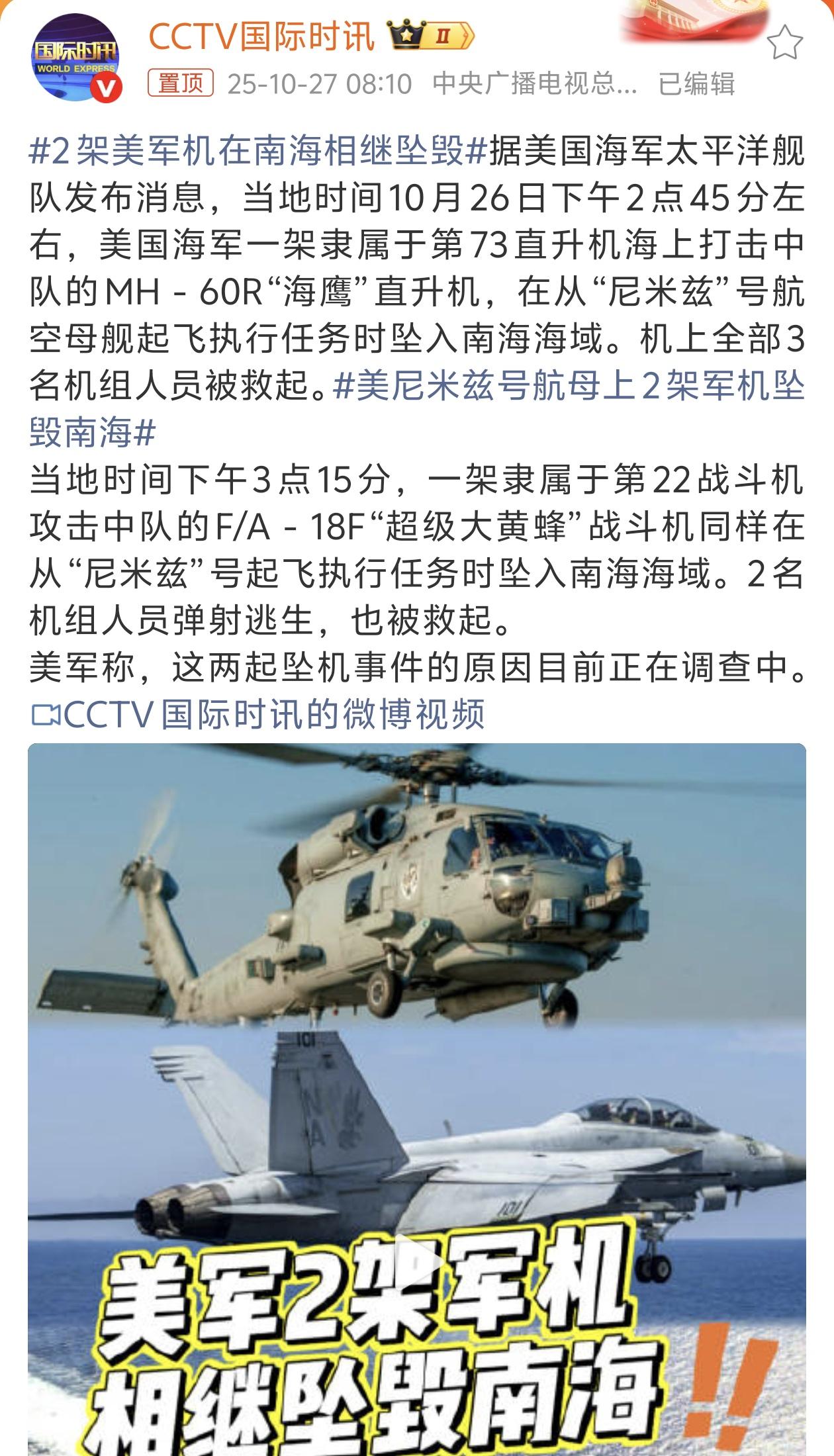 如何看待两架美军机在南海相继坠毁? 据@CCTV国际时讯 援引美国海军消息,当地