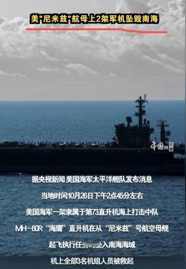 不用打,美军在南海自己掉下来两架军机!   让你别来,非要来,这下好了!据报道,就在昨天,南海上,美军“尼米兹”号航母一个下午掉了两架战机,既不是对抗时被打下,也不是遭遇突发气候,只是飞行操作时自己出事。   首先出状况的是一架MH-60R“海鹰”直升机,隶属于美军第73直升机打击中队,下午两点多,直升机刚从航母甲板升空,结果没飞出多远就掉进了海里,这个时间段,原本应是正常任务的操作流程,可现实却变得让人意外。   不过这还没完,紧接着在三点出头,海军陆战队第22战斗机攻击中队的F/A-18F“超级大黄蜂”战斗机,也在从“尼米兹”号起飞时,直接掉进了南海。   两起事故前后不到一小时,主角都是美军现役的精锐装备,连着两架军机折损在同一航母本身就很说明问题,不管是维保、操作还是人员精神状态,只要有一环出了纰漏,都有可能酿成这种结果。   事故发生后,航母上的救援响应还算及时,把所有机组人员都救了回来,算是挽回了部分损失,但两架先进军机,光是造价就不是小数字,更不用说对于美军战斗力的实际影响。   表面上看,他们跑到南海,硬是要做一个“自由航行”的样子,可还没等到什么冲突,自己的战机先“滑铁卢”,场面很是尴尬。   要知道,这片海域如今对美国舰机的“陪练”可不再像过去那样随心所欲,不仅有中国侧的实时跟踪,外部压力和技术比拼都明显升级,美军这回的表现着实不怎么拿得出手。   有人说,是压力和紧张造成了操作失误,也有人拿出来讽刺,认为他们被“看管”得心神不宁,无论怎么解释,美军自家飞机失事,最终坐实了其所谓“威慑”行动其实不过如此。   展示肌肉容易,真要面对南海复杂局势,装备技术和人员素质的短板马上原形毕露,毕竟,在我们的家门口,力量想秀出来不是那么简单的。   各位怎么看美军这次在南海接连掉机?欢迎留言讨论。