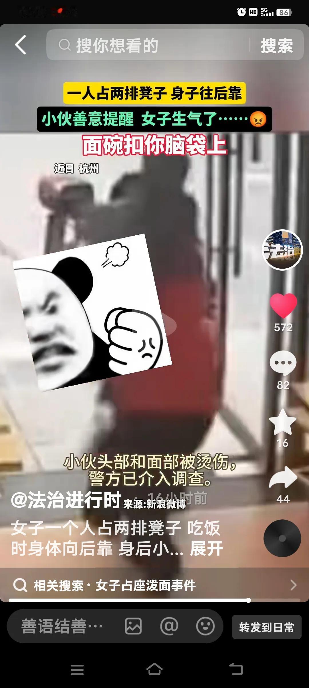10月19日上午10点,杭州滨江区的一家面馆里,发生了一件闹哄哄的事儿。一位女子吃饭时一人占了两个座位,后排的小伙子好心提醒,女子竟直接抄起翻热面碗扣在了小伙子头上。 小伙子只是好心让女子往前挪挪,女子不仅不道歉,还大喊大叫,随后端起滚烫的面就扣在了小伙子头上,导致小伙头部和面部被烫伤。这操作实在离谱,周围人都看呆了。 女子泼完面就往店外跑,这下小伙真恼伙了追了上去,后排的一个红衣服人也起来追了过去与女子扭打在一起。虽然女子力气大挣脱了,但她估计也知道自己理亏,又折回了店门口。 这位“胖仙女”把别人的包容当成了软弱,这下尝到冲动的后果了吧。警方已经介入,交给法律处理,后果只能自负。有钱任性就作吧,年纪轻轻的,怎么连道理都不懂,何必呢? 面馆纠纷 面馆冲突 杭州面馆 小面馆事故