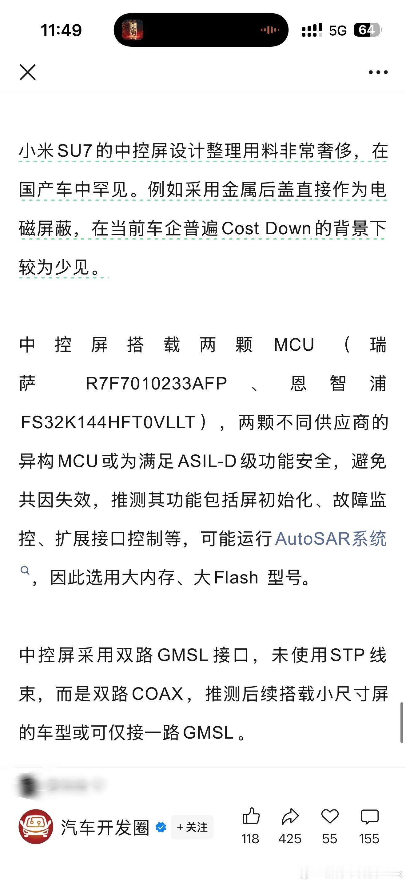不仅一堆车企和机构买SU7回去拆解对标,各行各业的博主也是对小米SU7进行各种拆解,最近就有对小米SU7的中控屏做了拆解和用料分析,其指出小米SU7中控屏在芯片用料上堪称“奢侈”[思考]