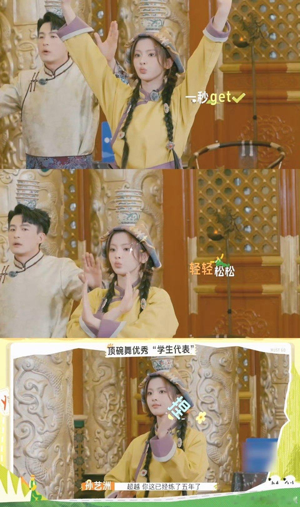 最适合杨超越的舞蹈出现了 杨超越跳蒙古族顶碗舞的适配度也太高了!别人还在反复练习找平衡、时不时扶碗时,她跟着老师学几遍就找到窍门,抬手、转身时头顶的碗稳得纹丝不动,连肢体舒展度都透着灵气,完全不像初次尝试。