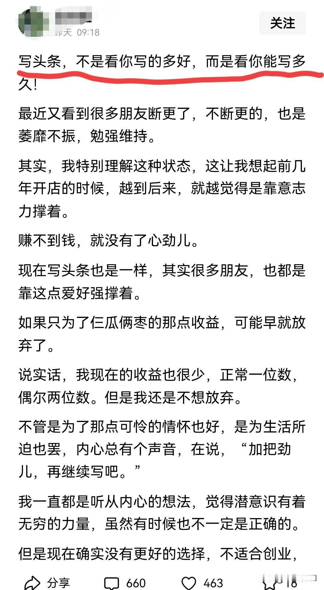 最近看到一篇文章,写得很不错,看了很有感触。其中有一句,说写头条不是看你写的有多好,而是看你写的有多久,对此我深以为然! 平时刷到好多网友的文章都已停更,有人可能觉得赚不到钱了,所以失去了信心,心累了,也不想写了,毕竟写文章很耗费精力。结果每天的收益和付出完全不成正比,那还不如放弃算了,受这煎熬干啥。 所以,当流量不好的时候,能耐得住寂寞,能坚持做到每天不断更,就已经打败了不少人。当然,写作除了能赚点零花钱外,同时也能给自己带来一份期许和快乐,让人每天都处在学习和探索之中,生活过得很充实。不知大家有没有这种感觉!(图片来自网络)
