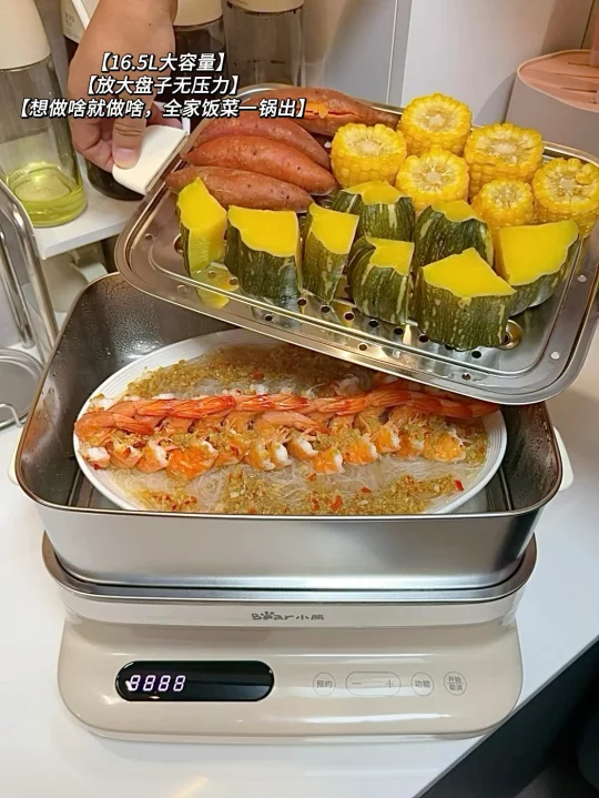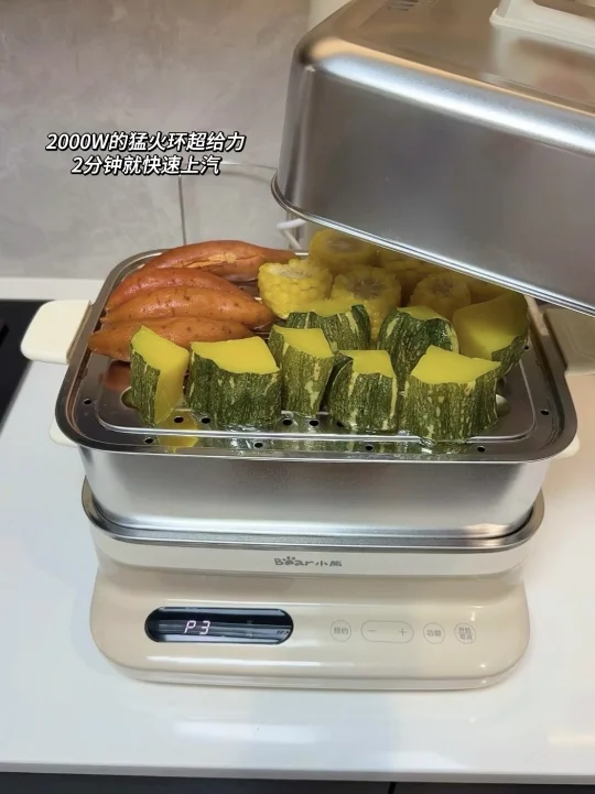 💨 2000W的猛火环超级给力,2分钟就快速上汽,8分钟就能把鱼蒸熟,锁住鲜嫩。16.5L的大容量,能自由组合三层,4.5L大水箱,加一次水就可以蒸2h,一次就能搞定三个菜,彻底解放了双手和时间。