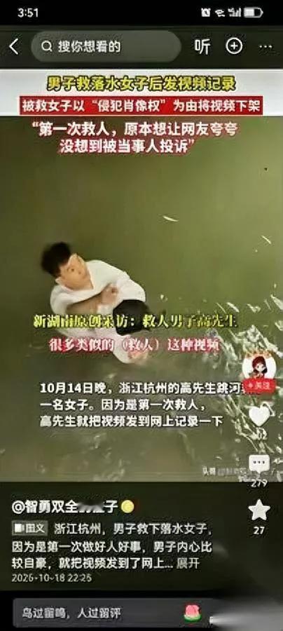 东莞女司机坠河15分钟没人救,根源可能就在这儿。 有个男的救了落水女孩,发个视频想求句夸——又没坏心思,结果女孩转头就投诉“侵犯肖像权”,把视频搞下架了。谁闲得看你长啥样啊?视频里都糊得看不清,你哪怕说声“谢谢”呢? 还有回救女人,男的急得一只手托着她胸部往上拉,结果被骂“手放错位置”。不是说救人得完美,但这种“咬恩人”的事,真让人寒心。 好人的热心不是用来被戳的——你把“伸手帮忙”变成“怕被反咬”,下次有人落难,别人第一反应不是冲上去,是先想“我会不会被骂?会不会被投诉?” 东莞那15分钟的沉默,说不定就是好多人想起“救了人反被坑”,才不敢动的。 你们说,要是你救了人被这么怼,下次还敢不敢帮?