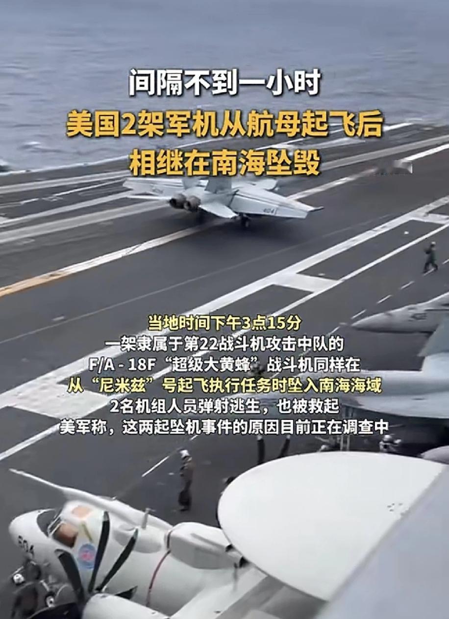 美军两架战机幸好掉进南海而不是红海,要不然胡塞武装又要称击落美军战机,而凑巧的是又有大黄蜂,而掉进南海,但旁边的东大只会笑而不语,有可能在笑老天开眼,也许在笑老美的战机垃圾,也许在笑美国军工是不是印度元素太多,摔飞机玩。