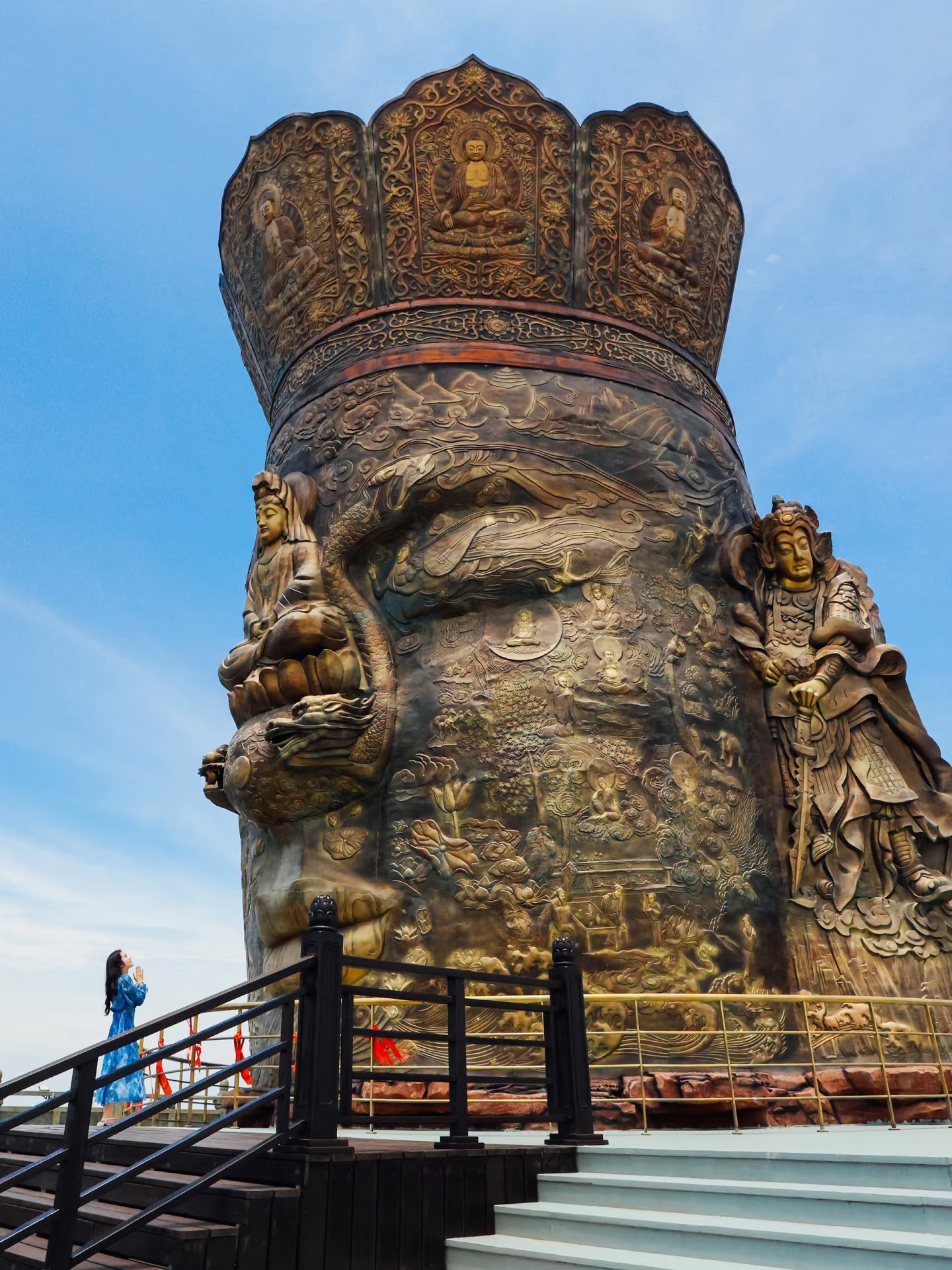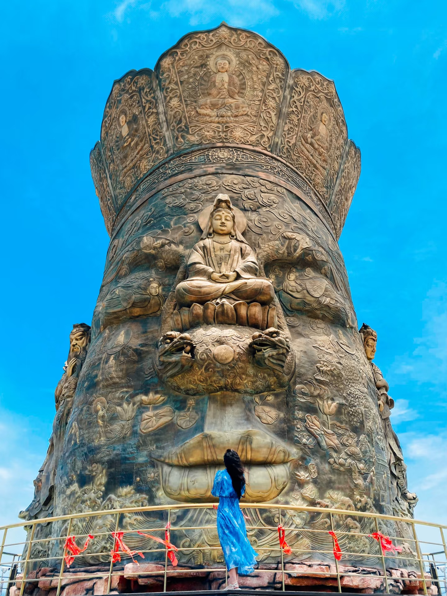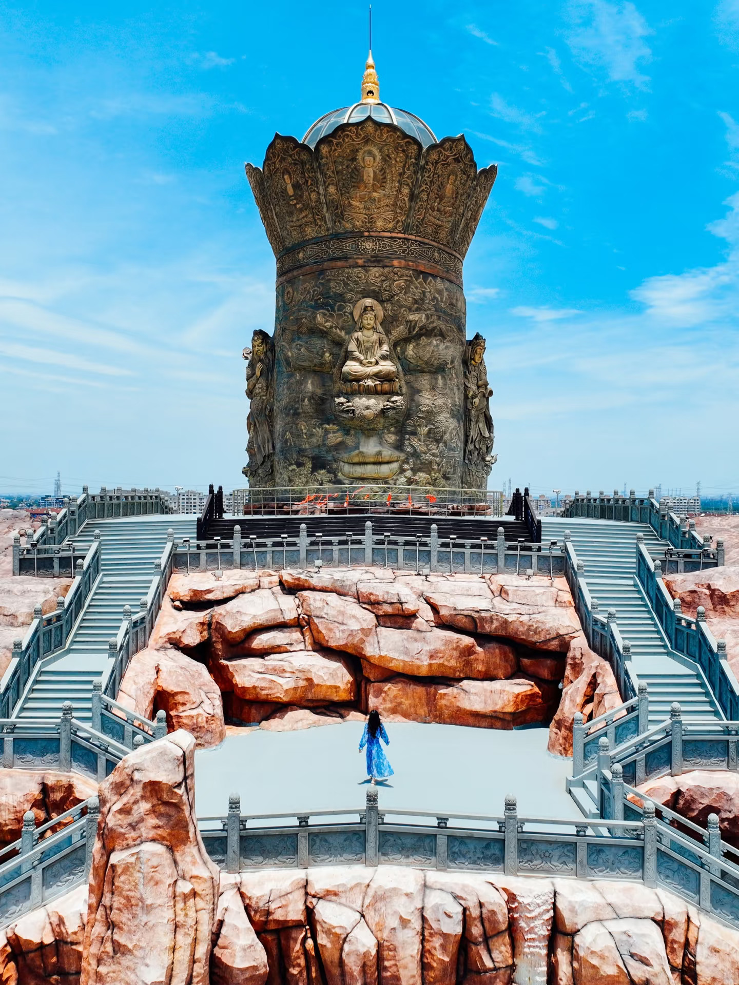 这尊佛像真的太奇幻了!整体是一张抽象的佛脸,眼睛是飞天,鼻子是观音,鼻孔是两个龙头,嘴是莲花座,耳朵是两个护法神。