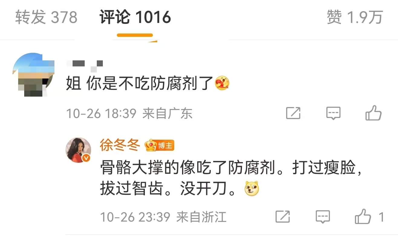 徐冬冬回应像吃防腐剂 徐冬冬这波回应也太拉好感了,很真诚回复:“骨骼大撑的像吃了防腐剂。打过瘦脸针。拔过智齿。没开刀”但这些不影响姐姐是原生态美女呀
