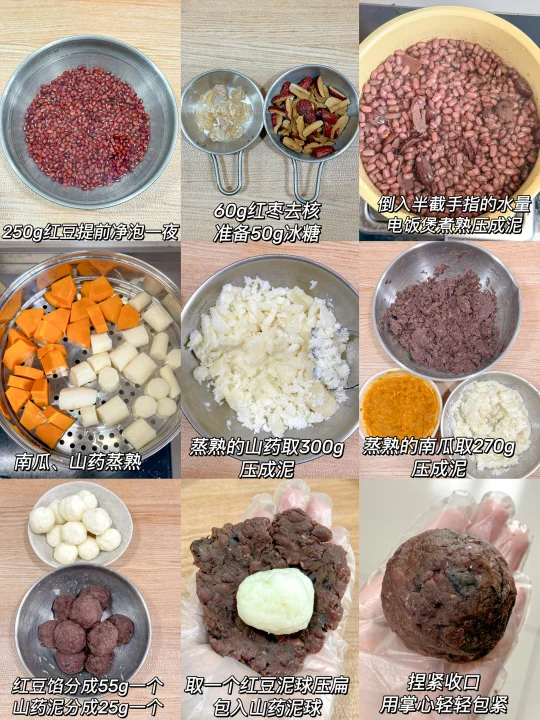 馅料部分:250g红豆|60g红枣|50g冰糖|300g山药泥
