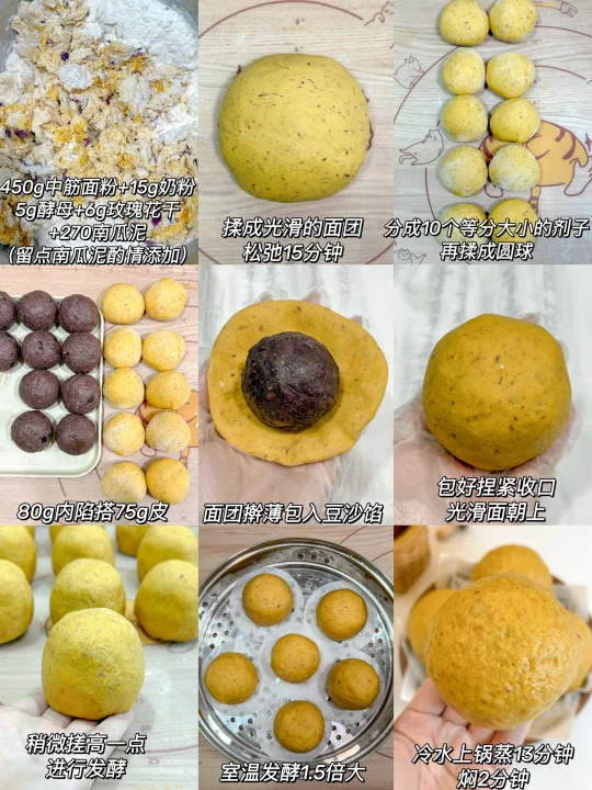 面皮部分:450g中筋面粉|15g奶粉|5g酵母|6g玫瑰花|270g南瓜泥