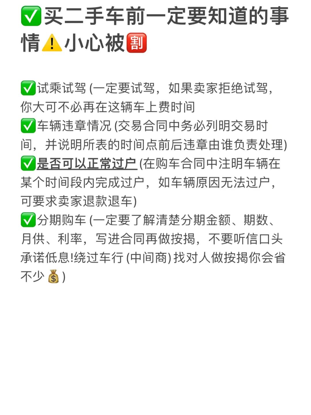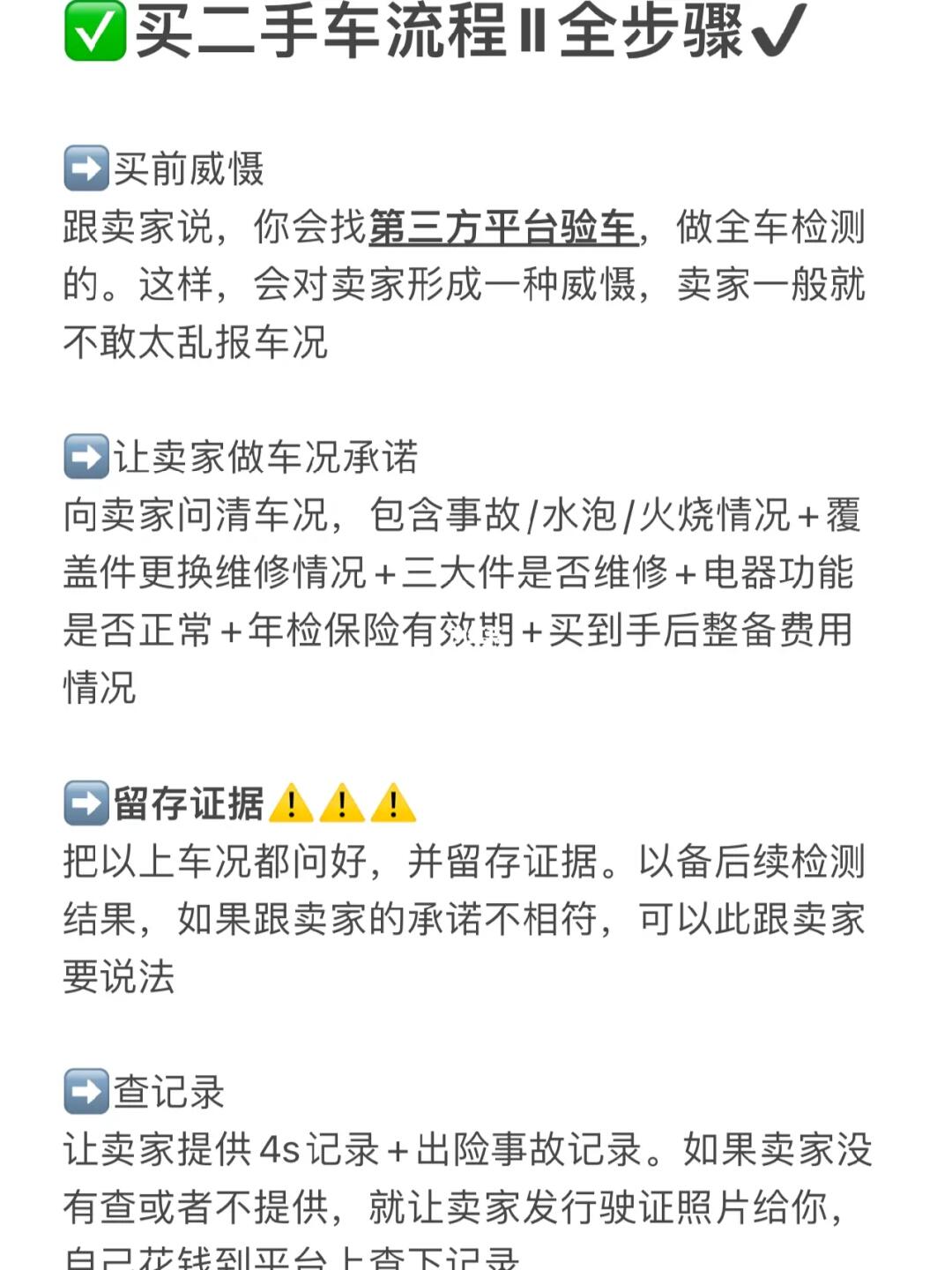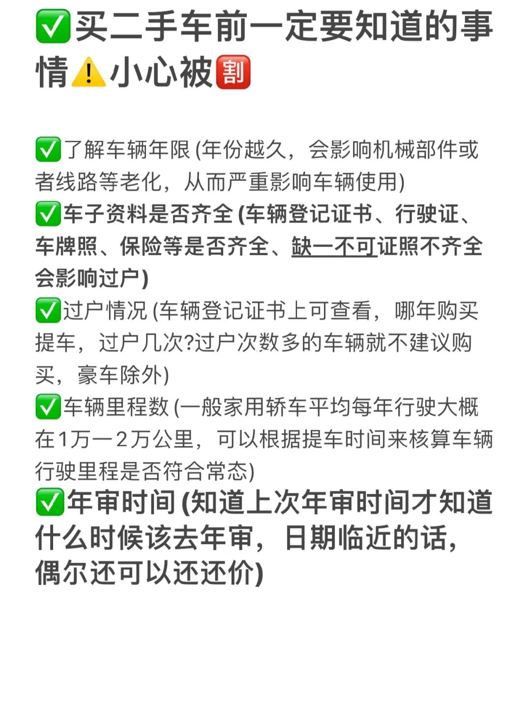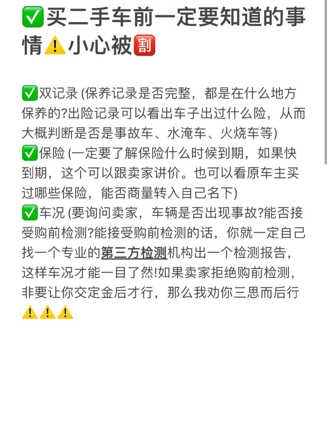 6、7🈷️计划买二手车的朋友看过来‼️ 车贩子套路又又又升级了⚠️😭😭 这些坑你们千万别踩l‼️ ✅【图2-4】:买二手车前一定要注意的点➕过户、里程数、年审、双记录、保险、车况……缺一不可‼️小心被割韭菜 ✅【图5-7】:提二手车全流程‼️手把手教你怎么买⚠️谈价、签合同、提车…. 主页还有更多二手车、新车攻略✅ 🔥关注团团,帮你买到最心仪的车🔥