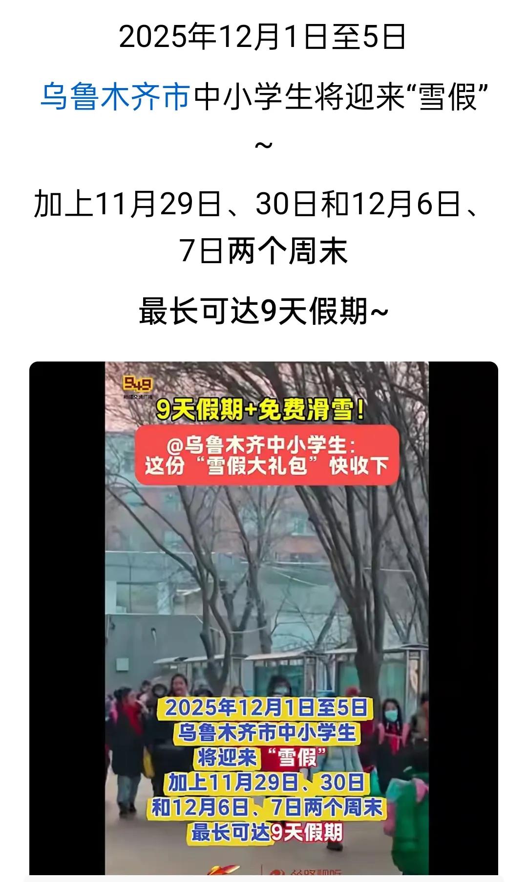 已经有学校准备开始放雪假了。 国家号召的春秋假,在不少地方正在慢慢的落实,除了浙江广东湖北等地之外,多数省份还没有明确的行动。 但已经有的地方的学校,开始准备放雪假了。 据官方报道,新疆乌鲁木齐将在2025年12月1号到12月5号放5天的雪假,再加上前后两个周末,最长可以实现9天的假期。 雪假,放假且不说,连名字都如此的充满诗意。 南方的朋友可能不太了解,北方下了雪以后,那真是孩子们的乐园。 滑雪打雪仗堆雪人等等,可以玩的不亦乐乎。 相对于春秋假,雪假可能是真正给孩子们放松自我的机会。 春秋假家长不放假,孩子在家里更多的时间,要么学习,要么和电子产品为伍。 而雪假,估计也很少有人外出旅行,更多的就是在家门口,甚至在楼下就开启了玩雪模式。 这个假是真正放给孩子们的,真正的放松自我,感受童年生活快乐的假期。 而且,乌鲁木齐的这次雪假,不像很多地方抠抠搜搜的。前后两个周末可以连休,一共9天,比十一黄金周假期还要长。 这也真正的实现了国家在提振消费的通知当中所表达的,因地制宜,探索适合本地发展的春秋假期的要求。 对孩子们来讲,这是一个很愉快的假期了。 在他们的童年记忆当中,也可能会因为雪假的加入,而变得更加的生动,更加的色彩斑斓。
