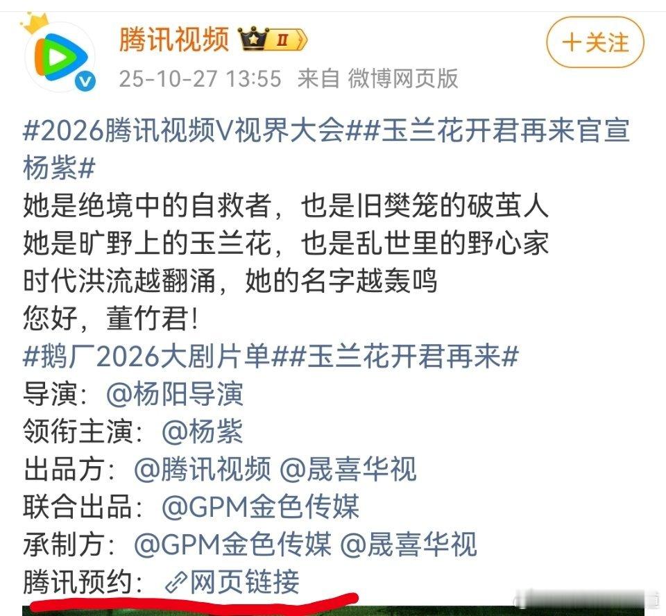 2026腾讯视频V视界大会玉兰花开君再来现在还只有一个概念海报,还只是官宣了杨紫,然后🐧就已经把预约链接安排上了,丧心病狂啊,这要大家等多久?看得出来🐧很急,但是你能不能不要这么急,迫不及待的感觉。玉兰花开君再来官宣杨紫