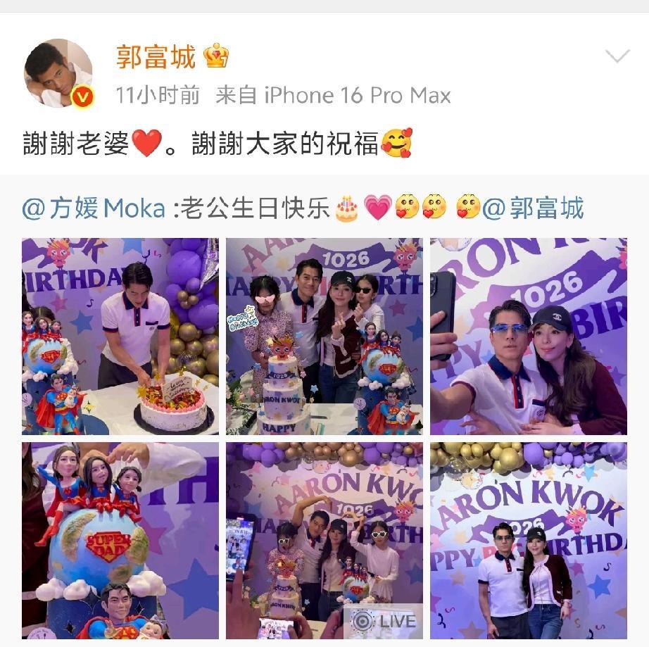 郭富城真幸福呀!昨天他过了60岁的生日,妻子方媛也现身为他庆祝一家四口各种比心。 刚生完小孩的方媛身材保持的真好,还穿着牛仔裤,肚子很扁平,有钱人真的很注重保养。 生日现场也是各种布置,非常的温馨,大宝和二宝很活跃,夫妻俩还在网络上公开秀恩爱,虽然年龄差距很大,但两人相爱抵过万难。 最后说一下他们的三宝,虽然之前很多港媒刻意报道他们生的是男娃,最后夫妻两人出来澄清是女孩,但他们一样爱孩子。 从生日蛋糕上就可以看得出来,郭富城像超人一样抱着孩子,方媛带着女儿在躲在他背后,好幸福的画面呀! 我也相信他们是真爱,大家说对吧![比心] 郭富城