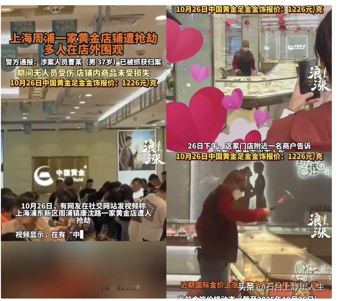 上海这起金店抢劫,看完我鼻子酸了! 10月26号上午,周浦一家中国黄金店,37岁的曹某砸柜台,右手持物砸,左手提个空袋子,赶到现场的保安和民警发现曹某并没有逃跑的意图,反而显得很平静。 据了解,曹某今年37岁,家住青浦,平时在建筑工地上打零工。 事发地黄金店工作人员称,当时金价每克1226元, 曹某并没有抢走黄金,而是站在店内等着被抓。 有网友说,曹某或许是因为生活压力太大,想进去监狱里过几天安稳日子。也有说,进去监狱也想过得温暖一点。 这是成年人崩溃时的无奈与苦衷。只是懂那种“成年人的崩溃不敢声张”的苦,想停一停,怎么就选了最笨的路? 网友说:有口饭吃是多么重要,把全国的养老金控制在5千以内,减低公务员工资,提高重大科研人员的津贴,让农民也有基本养老金。