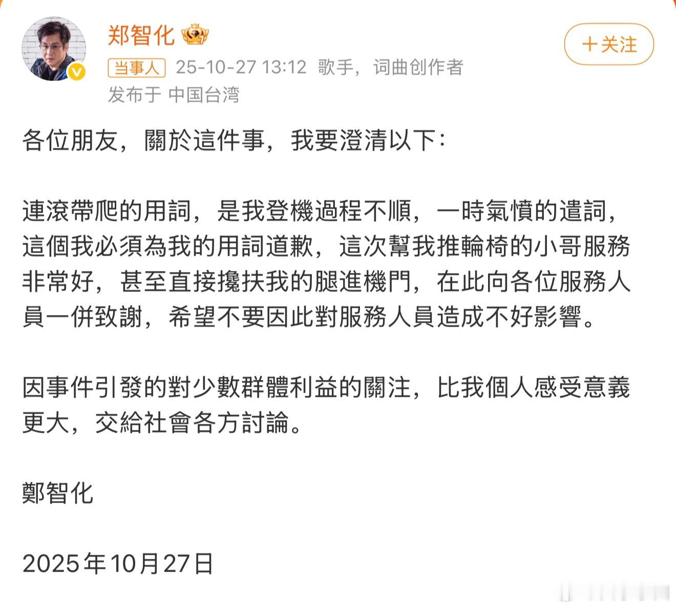 郑智化致歉