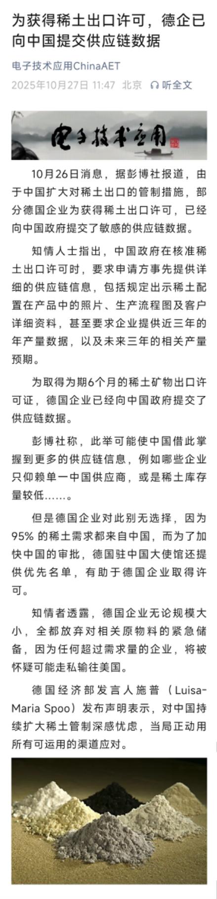 据彭博社报道,中国近期加强了对稀土出口的管控,部分德国企业为获取出口许可,已向中