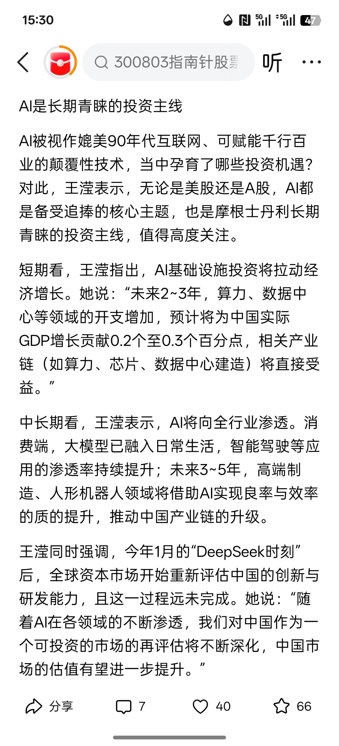 摩根士丹利:中国股市牛市可望延续,AI是长期青睐的投资主线 当前,中国股市放眼全球,今年是走势最好的一个金融资本市场!中国股市持续的上涨,吸引更多的外资来到中国进行投资!随着我国在科技自主创新,国产替代也展现出我们国家在科研创新方面已经不再是跟随者,更多的是创造者!外资也在大量的购买中国科技类的资产,毕竟中国是一个拥有成长发展的市场!的创新力度,大量的培养了科研人才,已经释放出科技未来发展的红利!