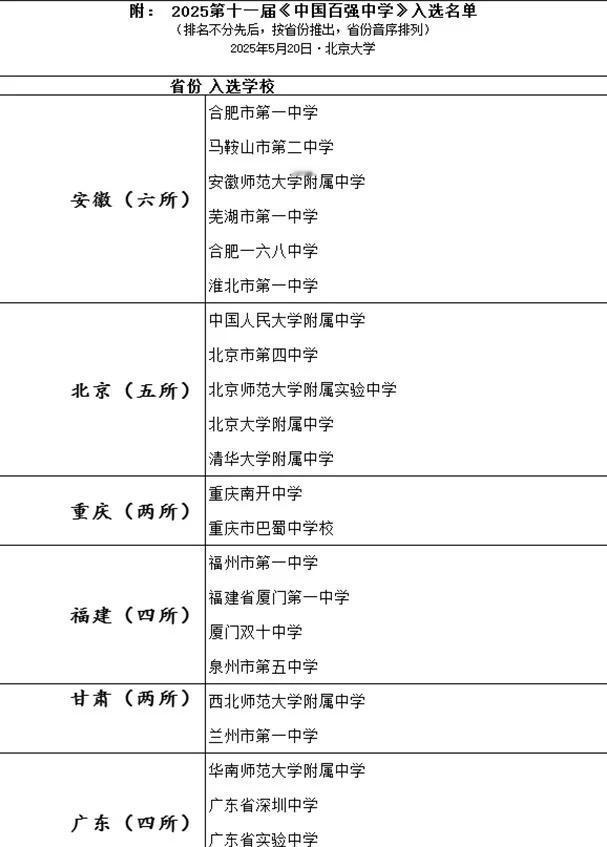 全国百强中学名单公布❗️这所学校竟没上榜❓ 教育圈重磅消息!🏆 2025年第十一届《中国百强中学》在北京大学隆重发布啦! 这份榜单被誉为“中国中学的最高荣誉”,今年已经走过第20个年头! ✨ 这份榜单的独特之处: ✅不进行排名:按省份推出,每省仅限2-4所,上榜即顶尖! ✅前瞻性评价指标:不看高考状元和升学率,而是综合考察 “学校声望”、“学生素质培养”、“校园文化”、“校友资源” 等软实力。 ✅邀请极严格:名单源于北大清华推荐制,本届还首次应用了人工智能和大数据确认! 🏆 湖南上榜学校完整名单: • 湖南省长郡中学 • 湖南省雅礼中学 • 长沙市第一中学 • 衡阳市第八中学 恭喜所有上榜的学校!这证明了该校在培养学生综合素质方面的卓越实力,获得了全国性的认可! 这不仅是对学术实力的认可,更是对学校综合教育质量的高度肯定!记录我的城市中国百强中学 名校 全国中小学 择校高中排行 选校参考 升学指南 志愿填报