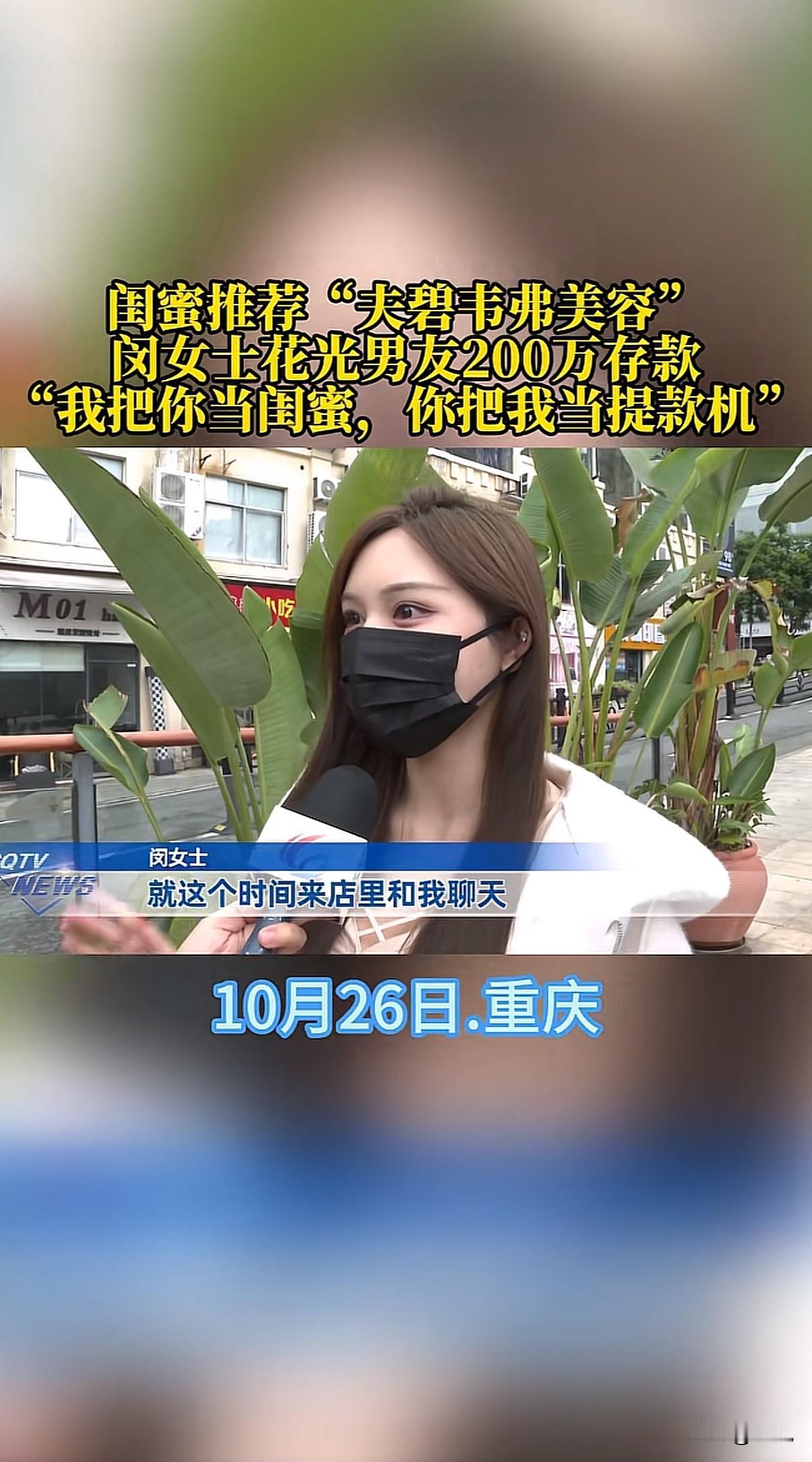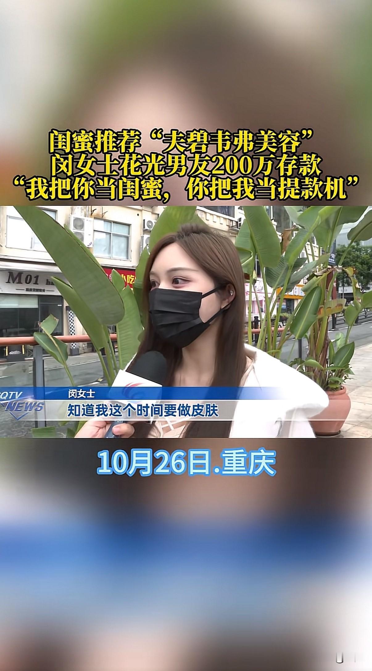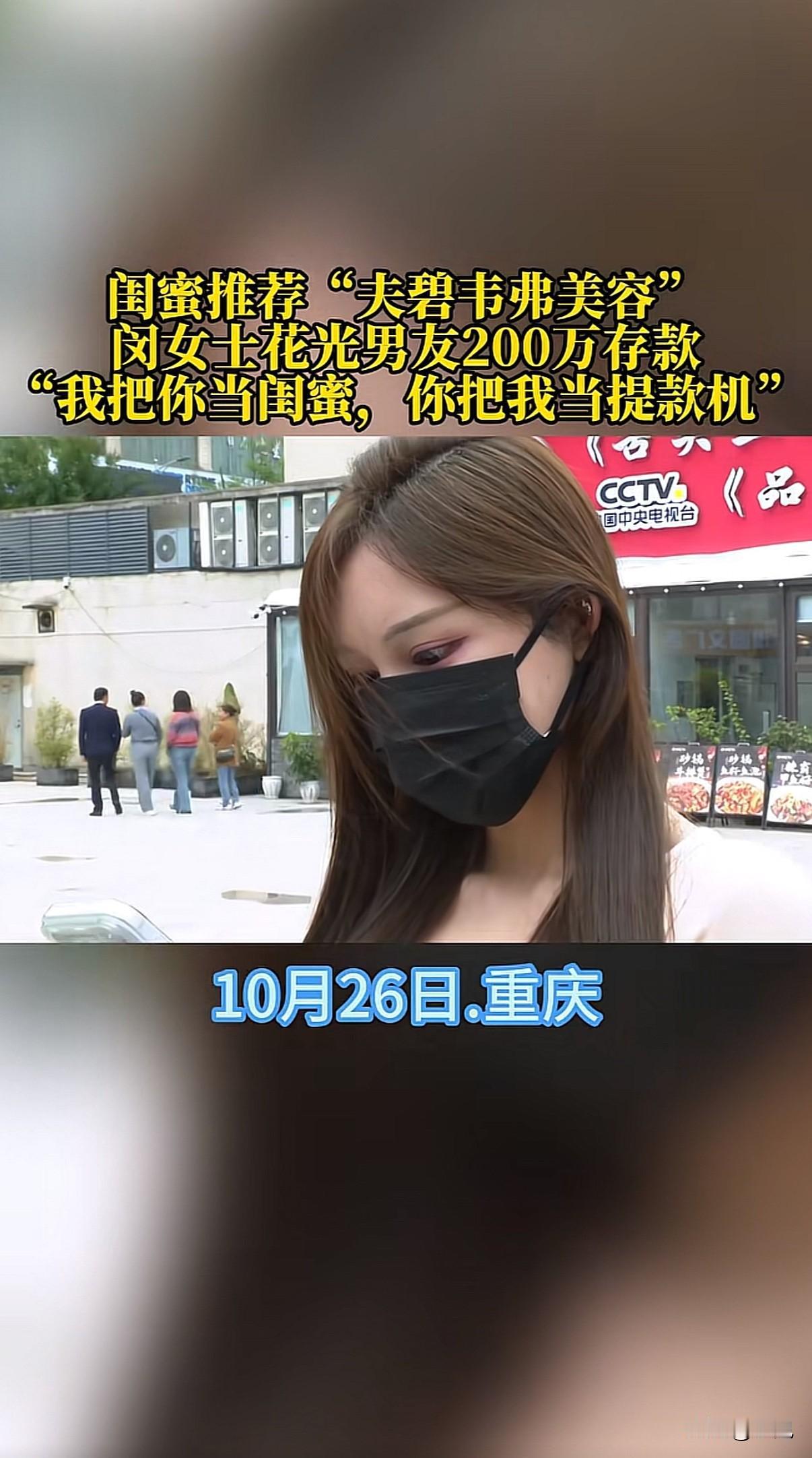“闺蜜坑光百万存款”!男朋友做生意赚了钱,把上百万交给女友闵女士保管。2025年10月,男朋友生意需要周转,让拿二十万出来,女友说没钱了。一查账,发现钱都被花在医美上了。 从2022年4月到2024年6月,两年时间,闵女士在“弗碧韦弗”医美机构消费130万。这还没完,后来她又去别的机构继续打针,前后加起来超过200万。 这些钱怎么花的?主要是打玻尿酸、胶原蛋白,每个月都要打一针,一针就是几万甚至十几万。 关键人物是她的闺蜜李某某。这人在美容院认识闵女士,迅速成了无话不谈的“好姐妹”。李某某经常跟她聊奢侈品、感情问题,建立信任后就开始说“你嘴唇薄显老”、“有皱纹影响婚姻”,一步步引导她做更贵的项目。 李某某是那家医美机构的股东。后来曝光的数据显示,闵女士支付的75万元中,成本只有12万,李某某赚了63万差价。整个130万的消费,返利高达90多万,李某某用这笔钱买了房、买了车,还到处旅游购物。 这就是医美行业典型的“渠道返佣”。熟人介绍客户,能拿到70%到90%的提成。你花三万块钱打针,可能两万七都进了介绍人的口袋。 事情曝光后,双方大吵一架差点分手。男朋友私下找李某某协商,追回了56万元。这些钱其实是基于部分消费的返利差额追回的。 最后两人选择和解。男朋友反思自己陪伴太少,闵女士也承认自己被利用,承诺以后多沟通。 医美这行水太深。免费美容、贷款美容,很多都是坑。有些机构说“零成本变美”,实际上是非法集资,等机构跑路了,美容没做成,贷款还得还。 去做医美前,一定要查机构有没有《医疗机构执业许可证》,医生有没有《医师资格证》。做完项目保留好所有证据:前后照片、知情同意书、收费明细。 别太相信熟人的热情推荐。有时候,她不是为你的脸着想,而是为你的钱包着想。 在脸上花钱和投资一样,都需要理性。有时候你支付的昂贵费用,买的不是变美的希望,而是别人发财的梦想。