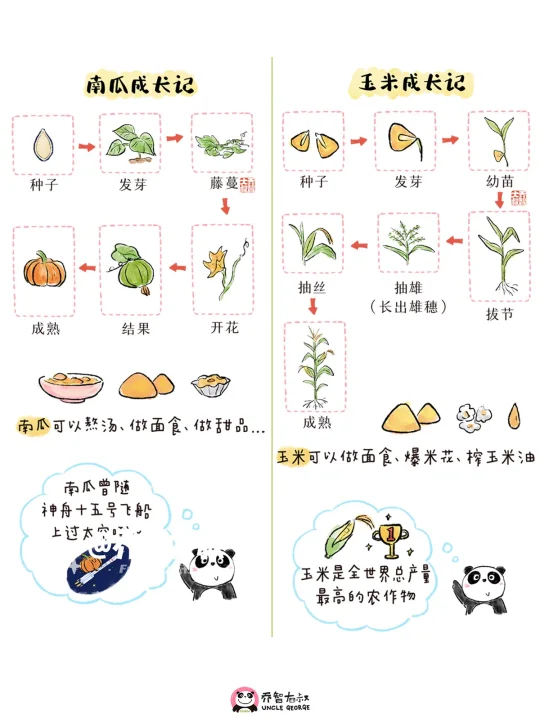 秋天是丰收的季节 我们吃的很多食物 都成熟在秋天 果实累累的秋天 大叔画了8种 在秋天丰收的粮食生长过程图 带孩子一起认识它们的一生吧 一蔬一饭,当思来之不易 一顿简单的饭菜 从田间到舌尖 凝聚着无数人的智慧和汗水 在五谷收获的季节里 请告诉孩子 珍惜粮食 从爱惜盘中餐开始 亲爱的小朋友 你喜欢丰收的秋天吗 你还知道哪些秋天成熟的食物呢 快跟爸爸妈妈一起探索 它们美丽丰饶的一生吧