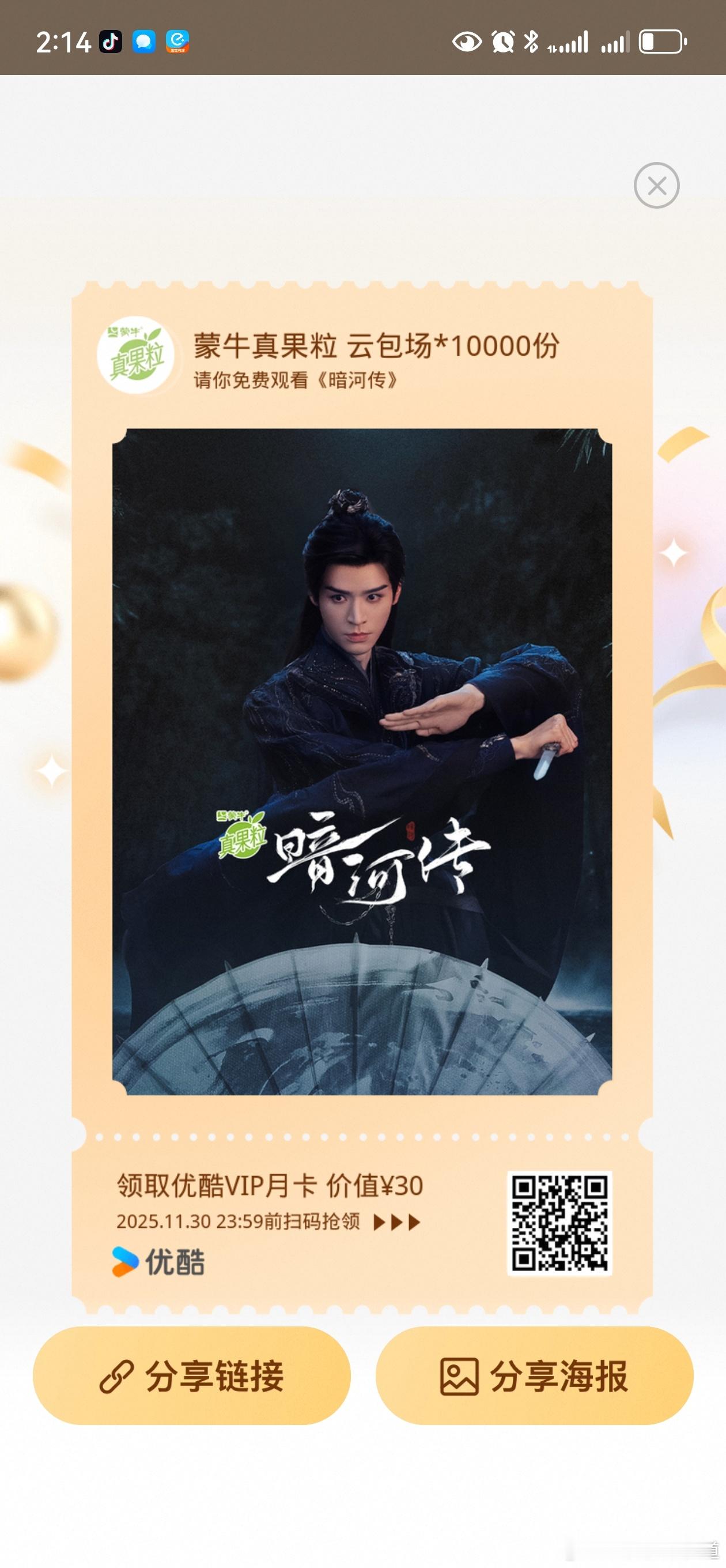 真果粒给暗河传加云包场了,十分钟就能领到,错过就没了,手慢无系列。暗河传