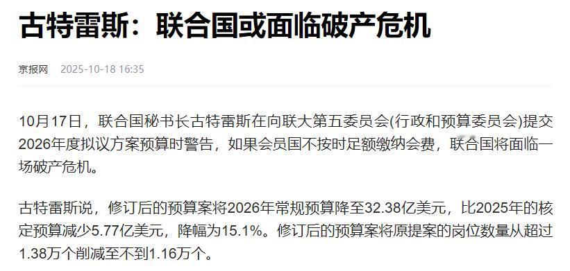 联合国又来要钱了,这次要钱要的很绝,很干脆,秘书长古特雷斯直接放狠话:不交钱就裁2681人,2026年预算砍15%,连“破产”俩字都抛出来了,看着是急到火烧眉毛,可明眼人都知道,这出戏的病根全在美国身上。 截至2025年10月,美国欠联合国的会费和维和经费加起来超过30亿美元,光常规预算就欠了15亿,占了全球所有国家欠费总额的七成还多。 按规矩,美国作为最大出资国,得承担22%的常规预算和26.15%的维和费用,可特朗普政府偏不按常理出牌,把会费当成了讨价还价的筹码。 早在2017年就冻结过5亿美元,现在更过分,2026年的财政预算里直接计划不掏维和经费了,国会里的共和党议员还公开说“凭啥美国要掏这么多钱”。 美国这一拖欠,联合国直接被架在了火上烤。古特雷斯10月17日拿出的预算案里,只能把2026年常规预算从37.2亿砍到32.38亿,2681人的裁员名单都列好了,相当于每5个员工里就要走1个。 更愁人的是,到9月底联合国才收到全年66.2%的会费,年底大概率会亏4.5亿美元,手里的流动资金都快见底了,到2027年可能还要退6亿美元,等于把家底都要掏空。 现在联合国总部连打印纸都开始双面用,员工出差只能坐经济舱,日内瓦总部为了省15万电费,关了4周还停了自动扶梯。 最受影响的还是维和行动。美国欠的30亿维和经费没到账,联合国只能把维和部队砍了四分之一,1.3到1.4万名军警要从马里、黎巴嫩等11个冲突地区撤回来,装甲车、直升机这些重装备也得跟着走。 这可是自1956年有维和行动以来最大的收缩,马里当地村民听说维和部队要撤,都着急了,因为之前有维和士兵在,恐怖分子不敢轻易进村,现在士兵一走,大家都担心安全没保障。 联合国副秘书长拉克鲁瓦急得直叹气,说维和预算差着16%到17%,“各国意见不统一,连应对危机都没力气了”。而面对这局面,各国的态度截然相反。 我国目前虽然也有6.85亿美元没交,但那是走流程的“程序性延后”,到最后一算我们可是一分钱都没少交。 可美国呢,一边占着联合国总部在纽约的便利,一边用欠费逼联合国妥协,特朗普团队私下还放话,只愿意给黎巴嫩、刚果(金)这些“美国关心的地方”掏维和钱,把国际义务当成了“点菜”。 美国这么双标,说到底还是“美国优先”的老思路。他们觉得现在的会费分摊让美国亏了,话语权却没跟上。早在2017年特朗普就骂联合国是“聊天聚会的俱乐部”,还威胁砍6亿维和经费。 现在共和党控制的国会更是把欠费当筹码,逼着联合国改规则,要么把维和经费上限定在25%,要么改成自愿捐款,谁想捐多少捐多少。 这场危机的影响已经慢慢显出来了,不光是办公经费紧张,人权调查、气候变化这些关键项目也因为没钱要停摆,原本要给非洲贫困地区送疫苗的项目,现在疫苗采购都卡壳了。 目前联合国大会第五委员会正在讨论古特雷斯的预算案,要到12月底才表决。可华盛顿那边政府停摆了三周有余了,两党为预算吵得不可开交,美国补缴欠款的希望实在渺茫。 这场由美国挑起来的“欠费游戏”,最后遭殃的可能是全球的安全和发展。