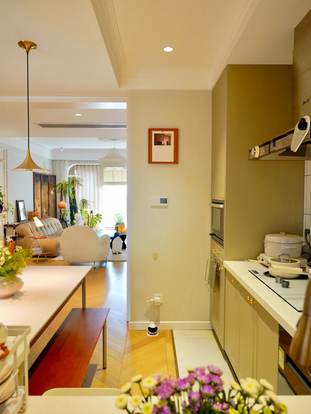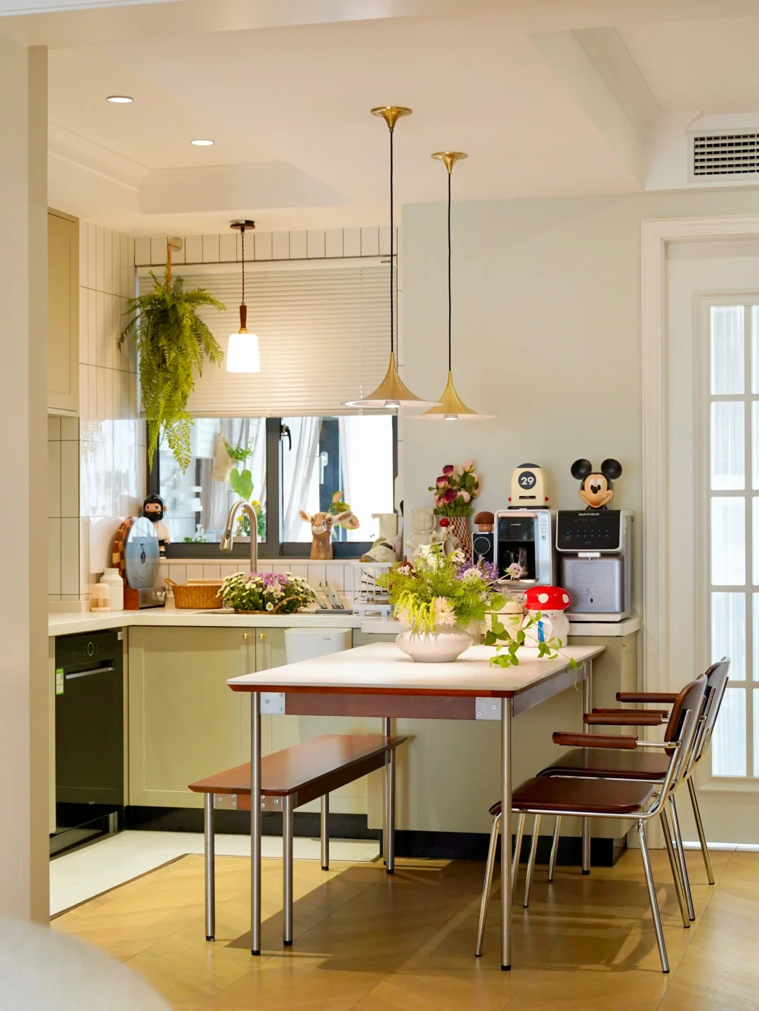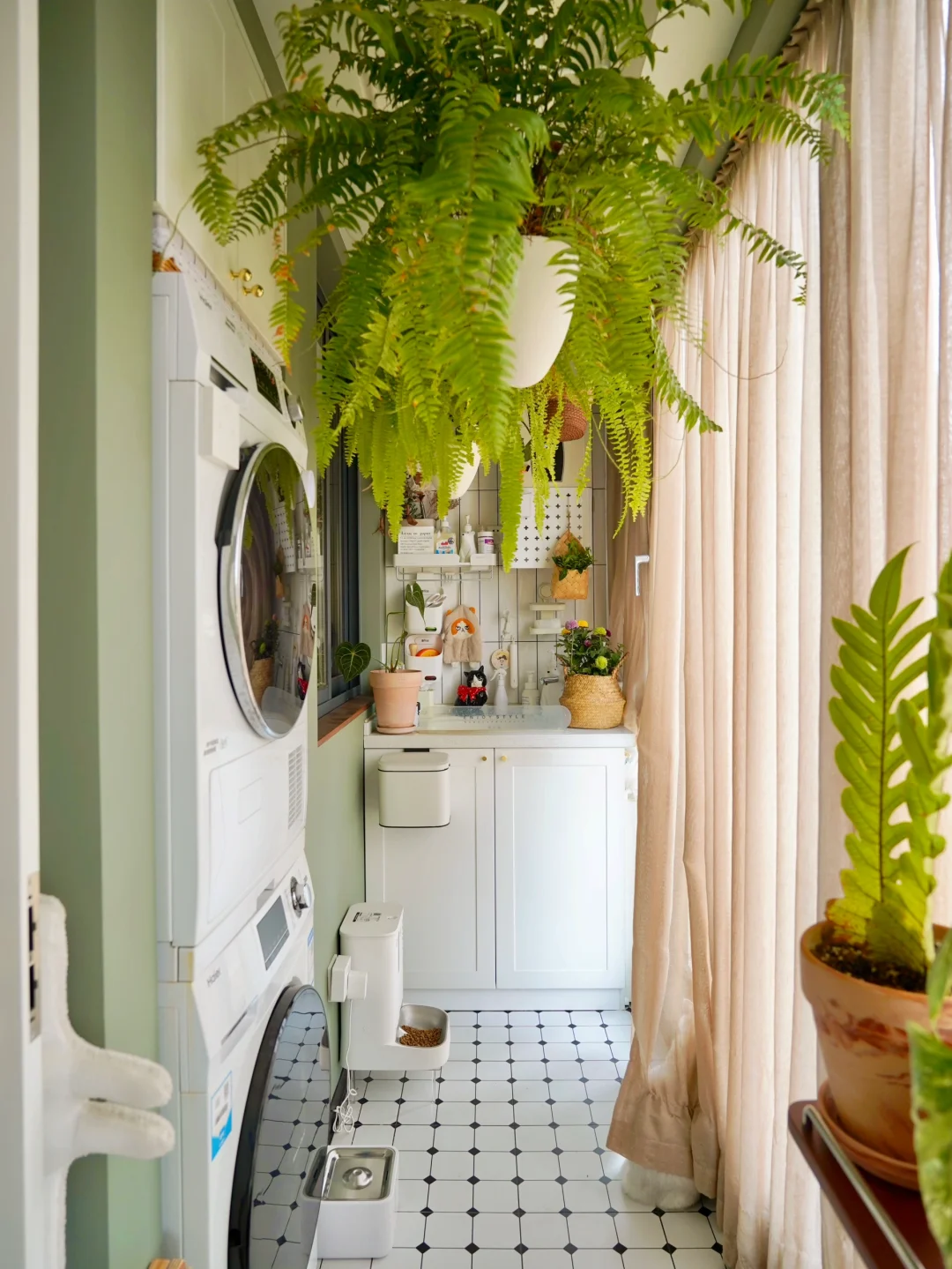 - 装修初期家属偏向还是不要保留生活阳台 我执着的想把休闲阳台和生活阳台区别开 所以在厨房和生活阳台的布置上还是动了一点脑筋 虽然厨房的空间要比同户型邻居的厨房空间小不少 但是我多出来的生活阳台区域也成了我的小确幸 厨房区域餐厨一体日常和家庭成员交互也变多 生活阳台既作为洗衣晾晒(虽然现在都在挂绿植) 又作为猫主子的生活用餐及猫砂盆区域 小小空间里被我布置成了“小森林”的样子 有时候“喜欢”比“合理”更适用自己