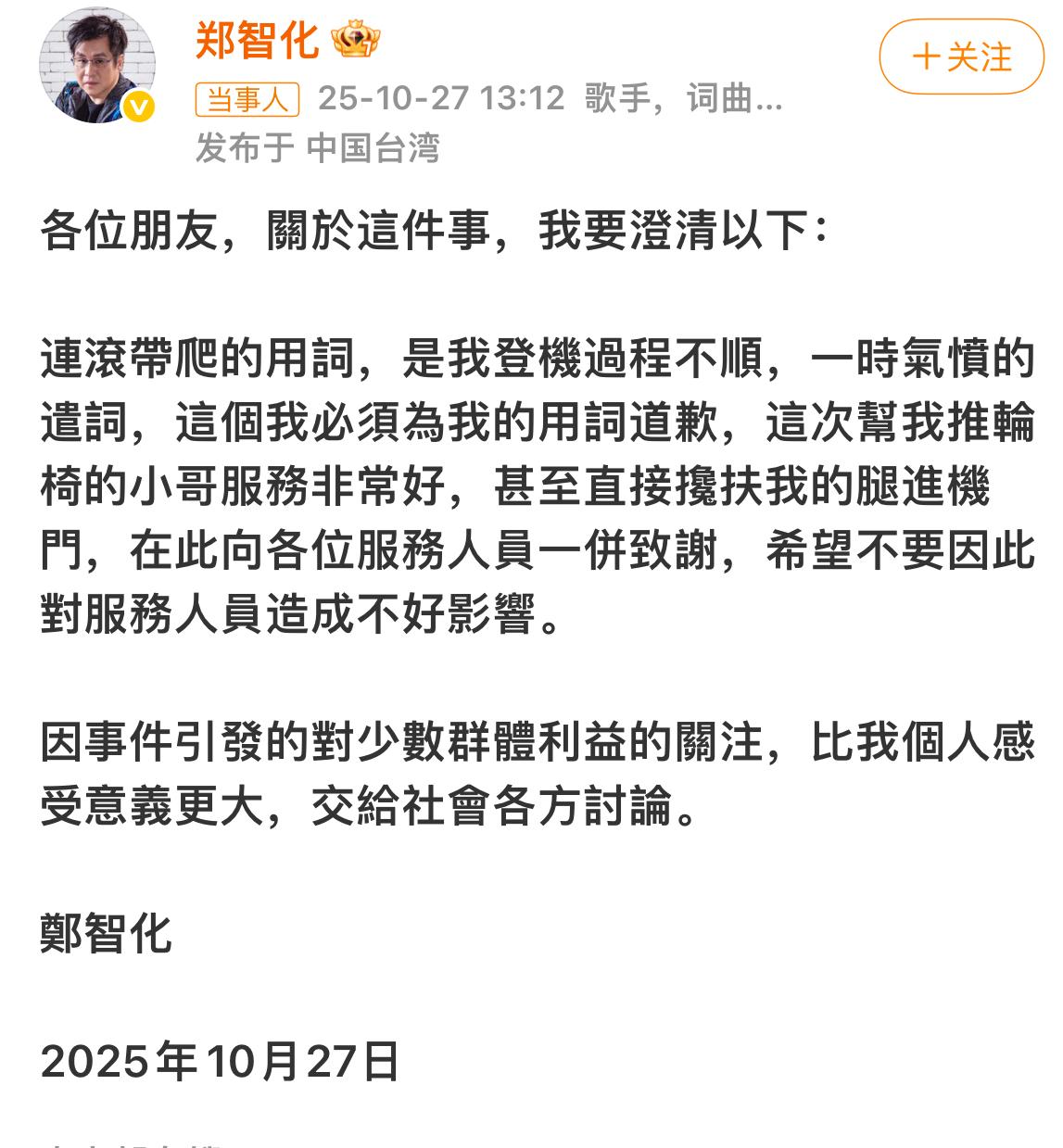 当善意被曲解,我们该如何守护善良? 郑智化先生,您该道歉的对象,首先是那位弯腰搀扶您登机的机场工作人员。 当您用“冷眼”“没人性”描述他的服务时,可曾想过他可能因不实指控面临处分? 尽心服务换来倒打一耙,今后谁还敢对需要帮助的人伸出援手? 其次,请别辜负大陆歌迷多年的支持。 您在这里收获掌声与厚爱,却因个别服务瑕疵否定整片土地的温暖。 多少人在您歌声中找到力量,如今却被您的片面之词所伤。 最后,请向所有关注此事的热心人致歉。 若每次善意援助都可能被反咬,社会信任的基石将一点点崩塌。 我们的确该包容长者情绪,但不该纵容罔顾事实的指责。 守护善良,需要每个人对真相负责。 既受他人援手,当怀感恩之心——这不仅是美德,更是底线。