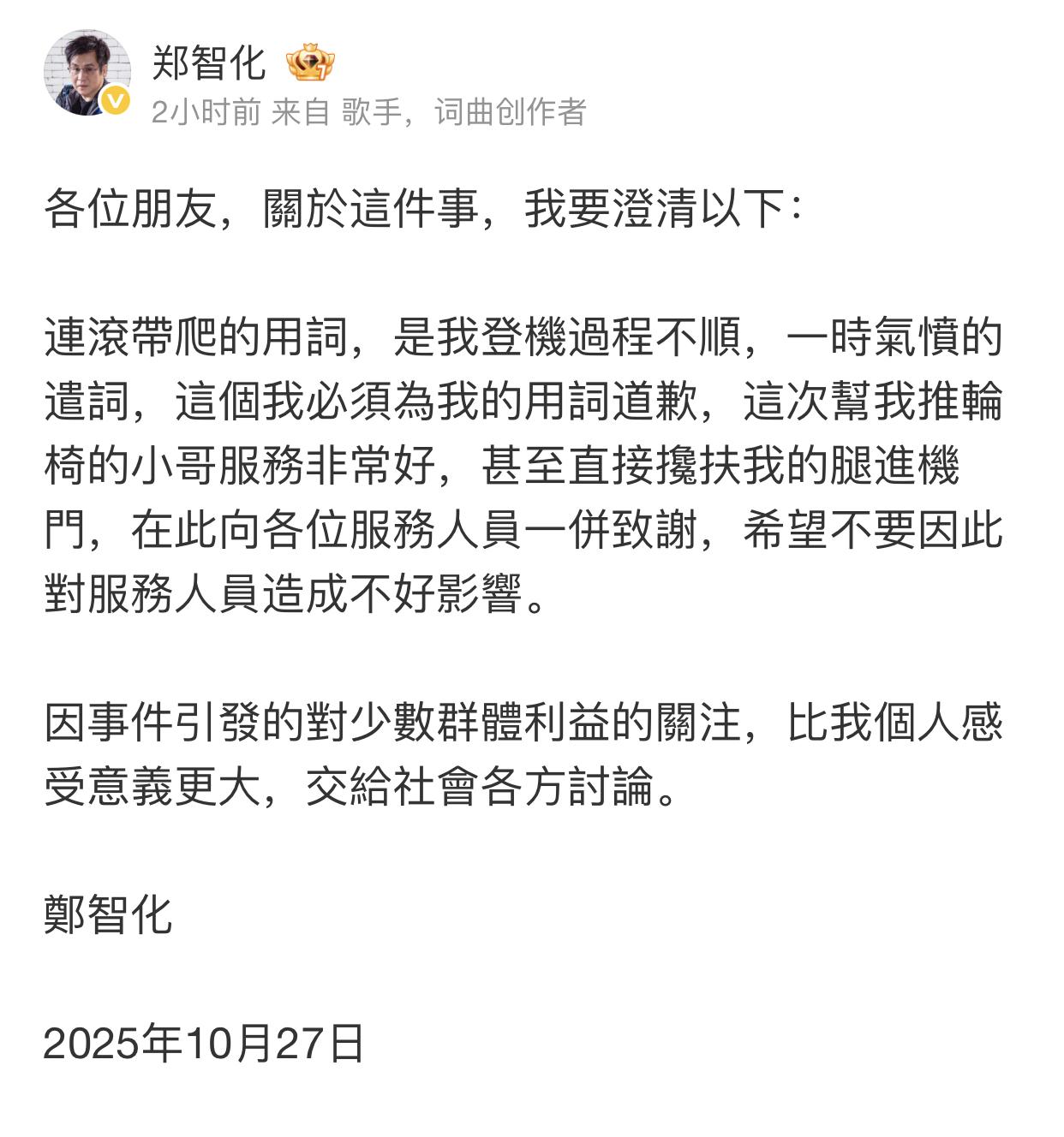 深圳机场的视频监控让郑智化道歉了。 他说想为自己登机过程不顺、一时气愤失语,用“连滚带爬”讲自己被机场服务人员小哥帮推轮椅、搀扶他的腿进机舱门的用词不当道歉,向机场服务人员致谢,希望他们不要受到自己过激言论的影响。