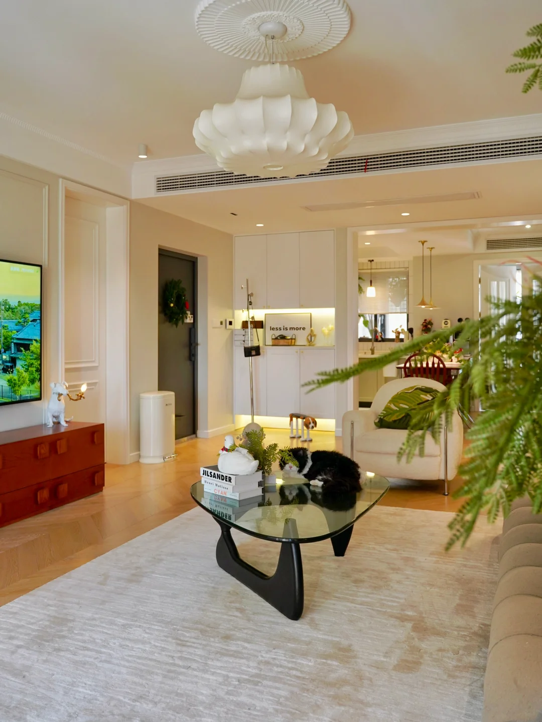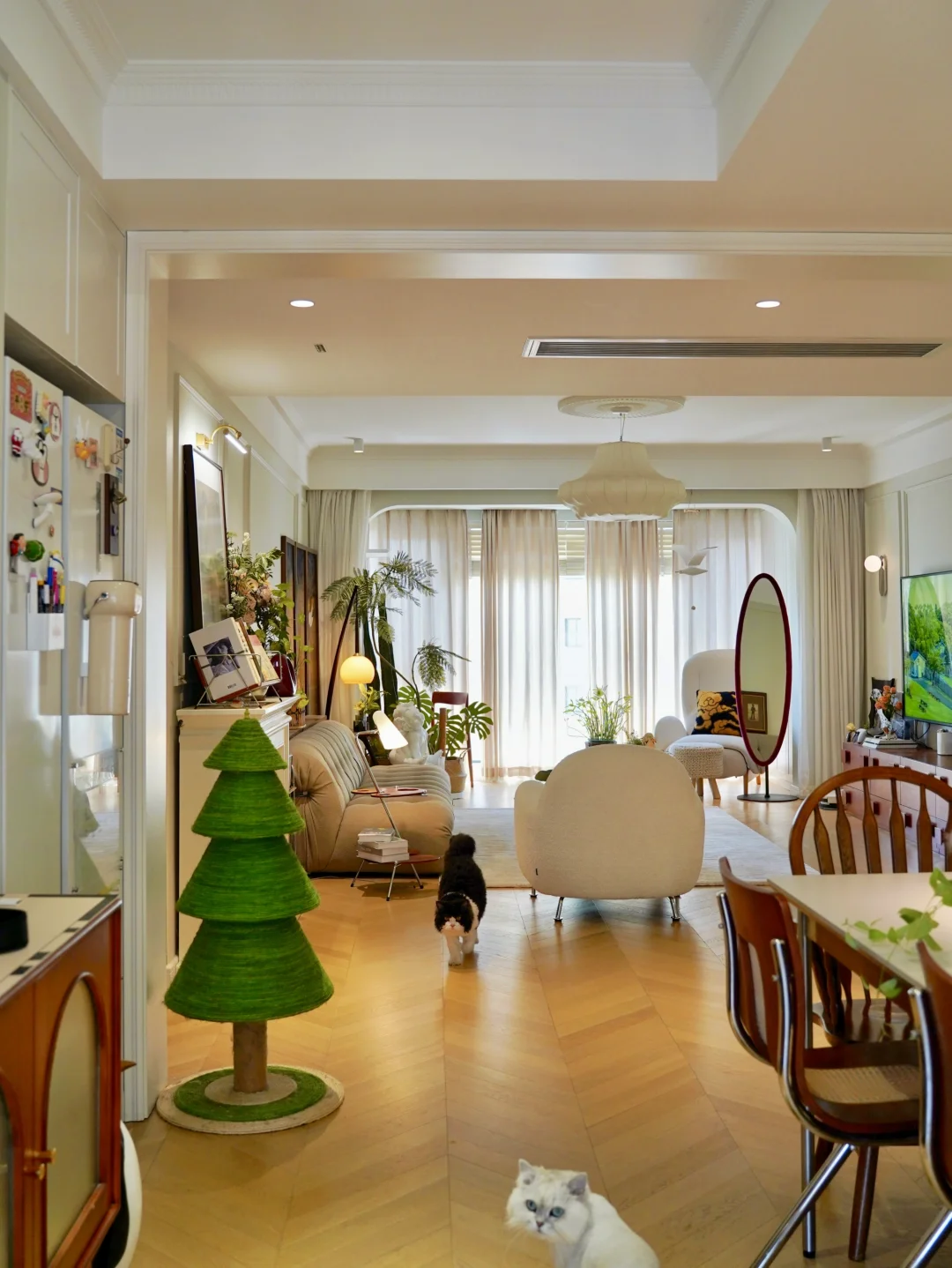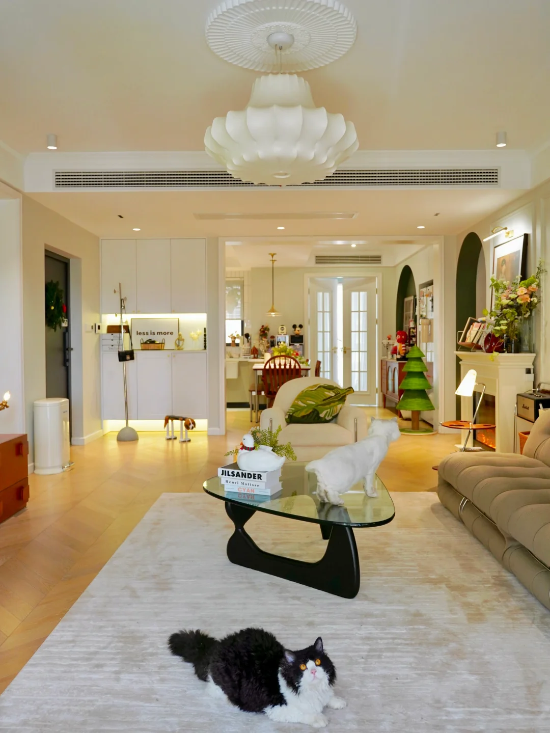. 大风天宅家能有多幸福呢? 室外狂风大作,室内温馨幸福~ 这个当初只存在于想象中的梦中情家 一眨眼也已经入住三年了… 但是每次踏入家门我还是会被这个家惊艳到 装修时轻硬装重软装绿植点缀~ 低饱和度墙面搭配暖色调家具 单眼皮吊顶加明装射灯简约又大气 虽然家里有三只调皮的猫咪和两个熊孩子 家里依旧能做到东西多但不乱、温馨又舒适 连邻居都说不敢相信小县城能有这样的审美~