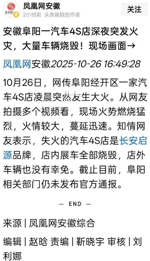 【长安启源一安徽4S店被曝起火】据多家媒体爆料,长安汽车位于安徽阜阳的一4S店被曝深夜起火,且火势异常凶猛。而火灭后4S则一片狼藉,有多车受损。不过针对此事目前长安汽车尚无公开回应,对此我们也将保持关注。 另据了解,此前去年6月也有一长安启源4S被曝起火,此类事件的发生也提醒我们,新能源车起火具备火势迅猛的特点,不论起火原因是否为车辆导致,但遇到相应火灾都一定要第一时间撤离。另外,我们相信本着为消费者和公众负责的态度,针对相关事件,长安汽车也会做出回应。长安汽车 阜阳一长安启源4S店起火