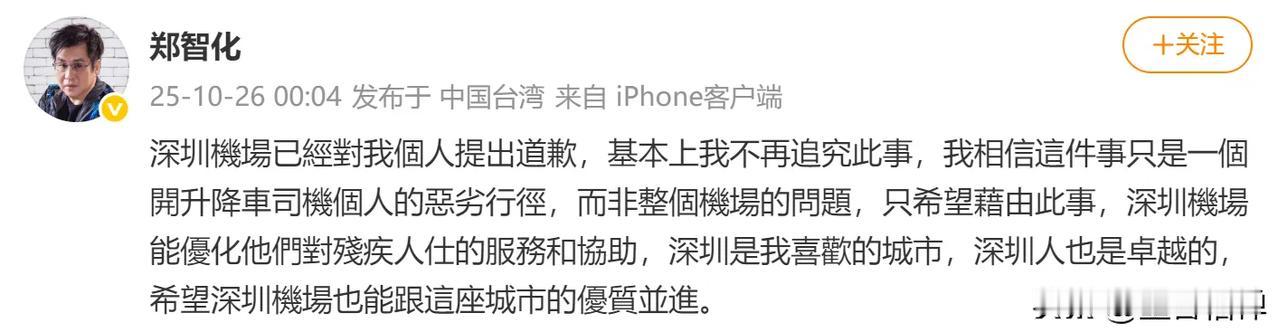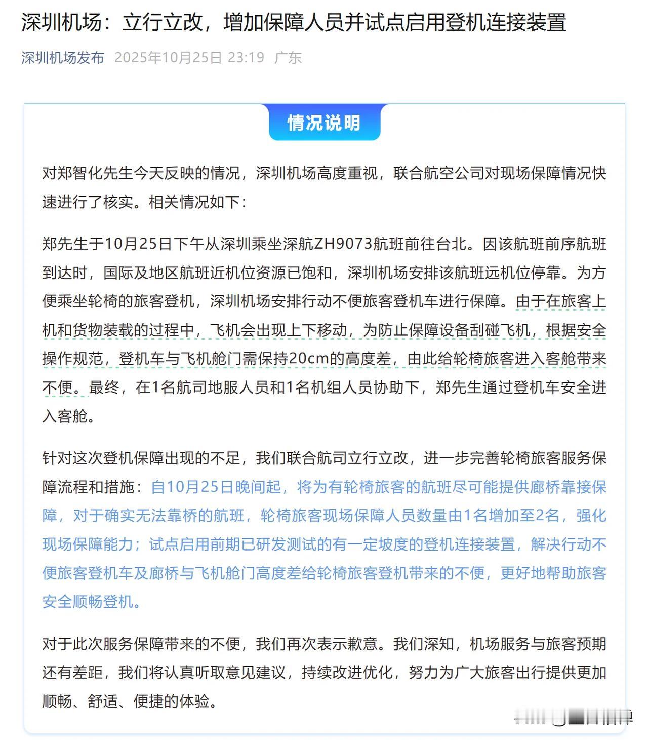 在深圳机场视频曝光之后,郑智化在深圳机场登机的事情出来做了致歉,说他用了“连滚带爬”这个词,不是很恰当,帮他推轮椅的小哥服务也非常好。 看了原视频,郑智化坐的是有深圳航空LOGO标志的轮椅,后面有两名深圳航空工作人员协助,前面有机组人员服务,这服务也没有什么可说的。 深圳机场也在10月25日发布了情况说明,针对郑智化反映的问题高度重视,立马整改,进一步完善轮椅旅客保障服务流程和措施。 不得不说这深圳速度还是真的名不虚传,回应和整改速度也是一流。