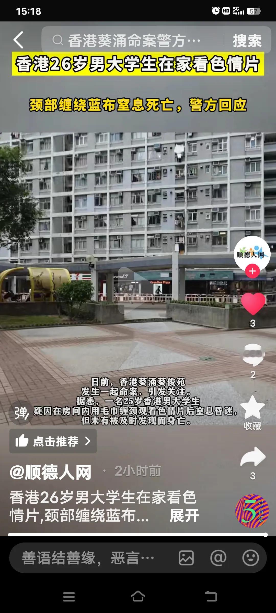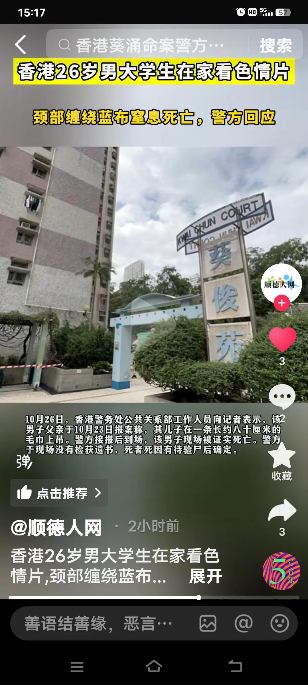 香港这起悲剧着实令人唏嘘不已。26岁的男大学生黄某,本当拥有大好前程。10月21日,他告知妹妹自己要准备考试,让妹妹别进房间打扰,此后家人一连几天都未见他露面。 23日晚,父亲打开房门,只见他仅穿着内裤,颈部缠着蓝布,已然昏迷,电脑屏幕上还显示着色情网站的画面。 警方到场后,确认他已经死亡。现场并未发现遗书,警方初步排除了自杀的可能性。目前,这起案件被列为“尸体发现”进行跟进,具体死因仍需等待进一步调查。 此事为众人敲响了警钟,年轻人独处时的安全问题绝不能被忽视,同时也提醒着家长要多留意孩子的状态。 实在是太大意了,家人总该叫他吃饭吧,这显然属于关心不到位。发现得太晚,连死因都不明白,实在令人后悔莫及。这可是一条年轻的生命,更是一个家庭的悲剧啊! 学生猝死 香港奇异事件