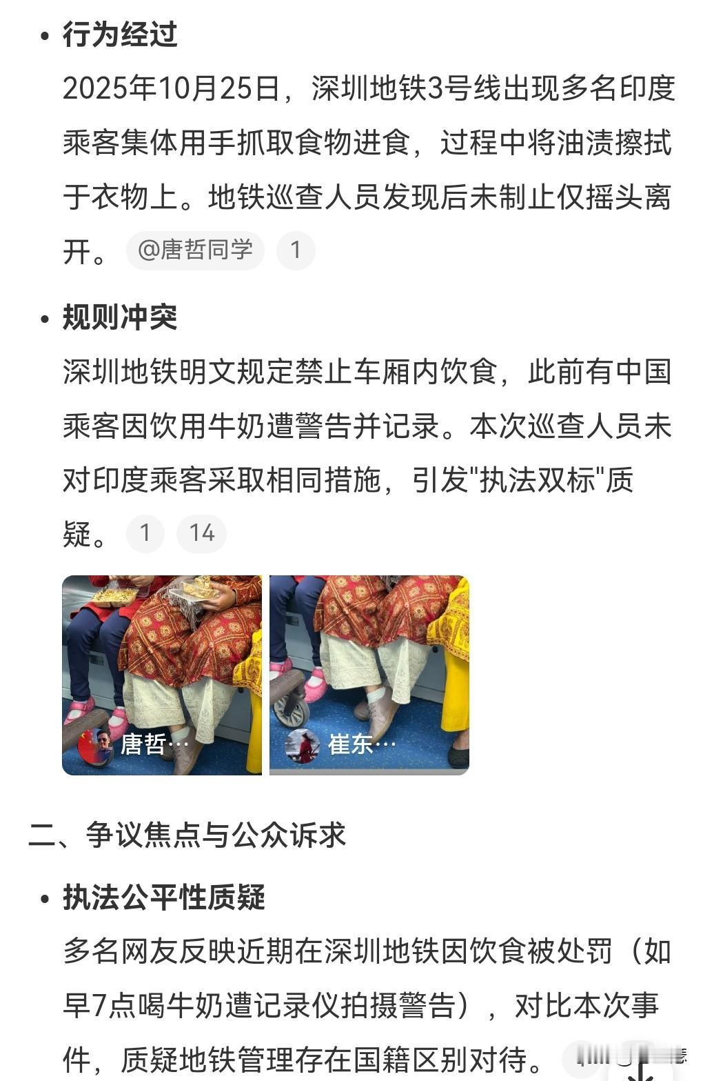 这真的是太双标了。中国人在地铁上吃东西就被管,印度人在地铁上吃手抓饭,巡逻人员不敢管。 这真的挺离谱。 10月25日深圳地铁,多个印度人深圳地铁吃手抓饭。 本以为巡逻人员会制止,结果只是看了之后摇摇头便走了。 这样的人不配当巡逻员。 难道外国人有特权吗?巡逻人员连管都不敢管。 这确实让人难以接受。 说好的一视同仁?