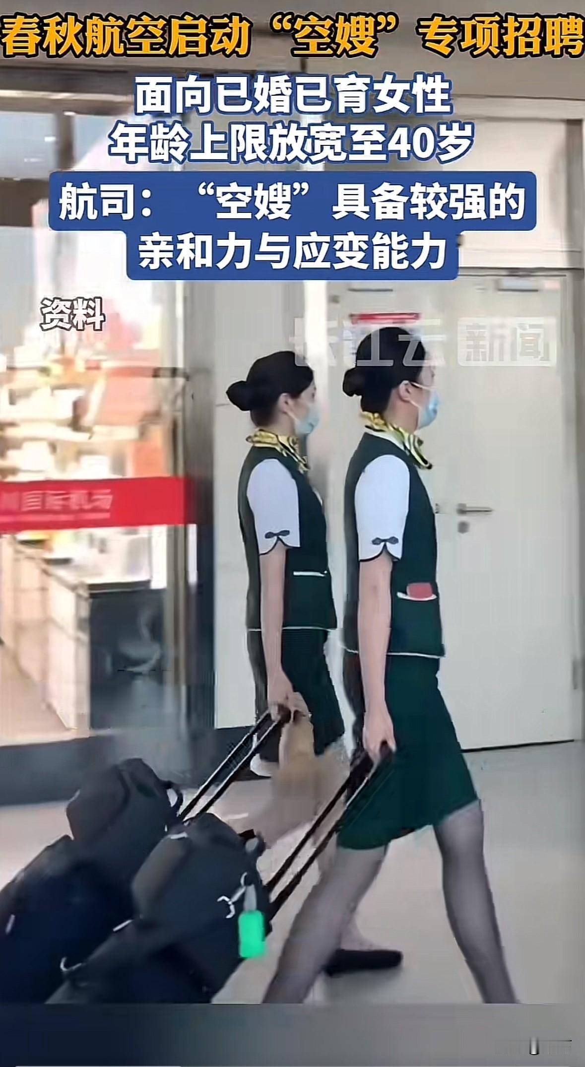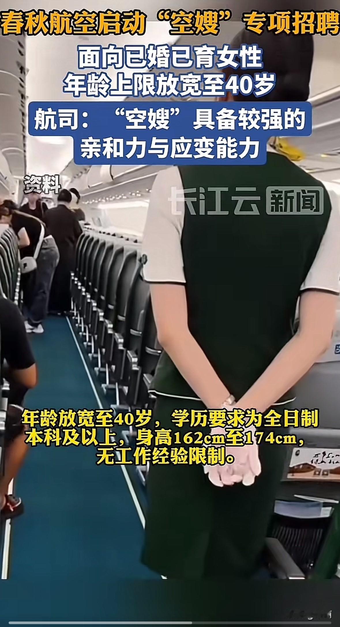 10月22日春秋航空在兰州启动“空嫂”专项招聘,面向已婚已育女性招客舱乘务员,年龄放宽到40岁,身高162-174cm、全日制本科就行,没工作经验和专业限制。 简历要投官网或招聘公众号,11月中上旬面试,和校园招聘同步,计划招30到60人,2026年初培训。 这事儿挺亮眼,打破了航空业招空乘的年龄枷锁。空嫂有生活阅历,带娃、处理突发情况更有经验,公司现有88名空嫂74%都升了管理岗。 对已婚已育女性来说是好机会,不少脱离职场的妈妈都想试试。有人说“空嫂”标签有问题,但核心是航司开始看重能力而非年龄,这种转变能让服务更有温度,也给其他行业做了示范。