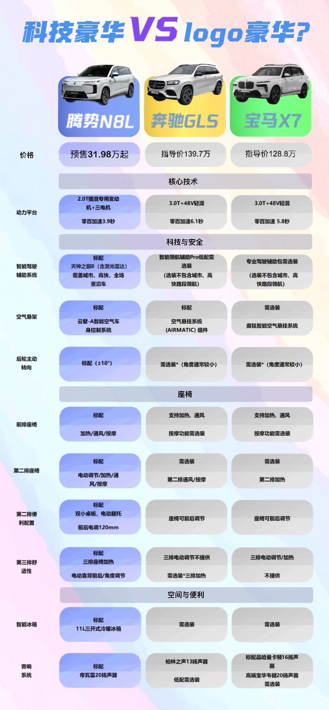 腾势N8L这台大六座SUV,起售价31.98万,却能给你百万级奔驰GLS、宝马X7的体验。一台GLS的钱能买三台N8L,可体验一点不打折。空气悬架、后轮转向、激光雷达,全系标配;副驾零重力座椅、二排腿托、帝瓦雷音响、冷暖冰箱、AR尾门,全都给你配齐。那些传统豪车要加钱选装的,N8L直接标配到位。最主要的是,第三排空间是真能坐,而且坐得舒服。